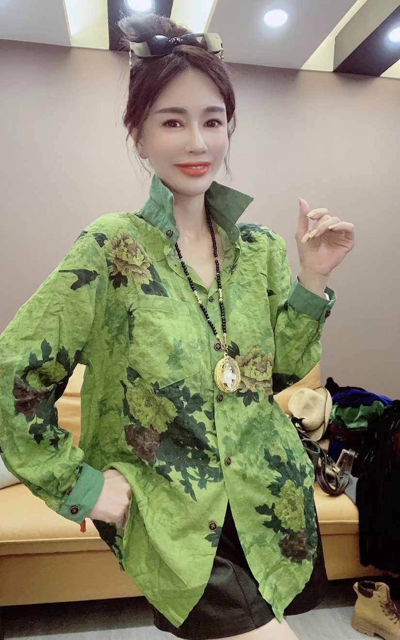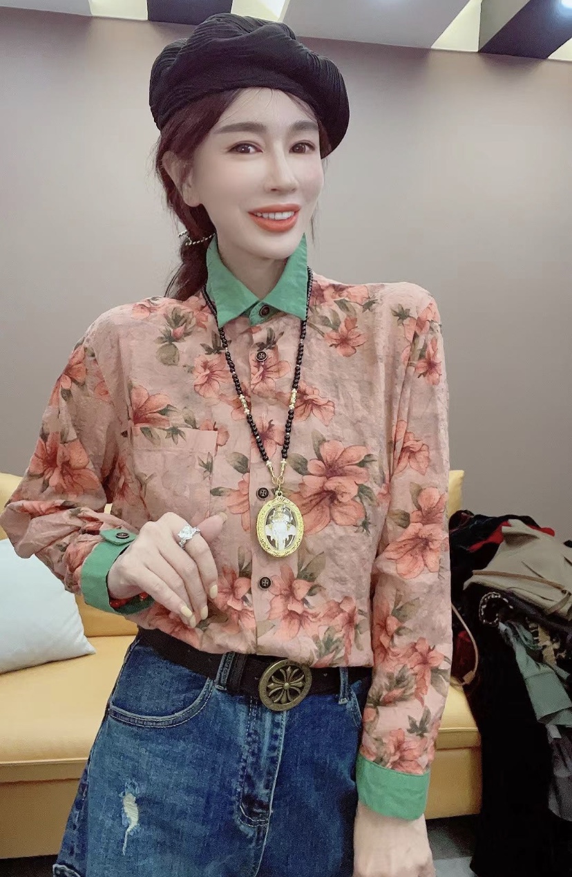 欧货春秋季新款棉麻长袖衬衣女宽松大码百搭休闲印花拼色衬衣小衫