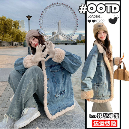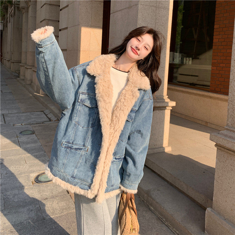 胖mm大码加厚羊羔毛牛仔棉衣外套