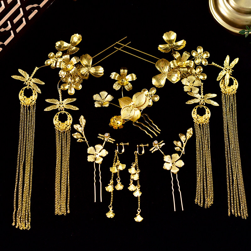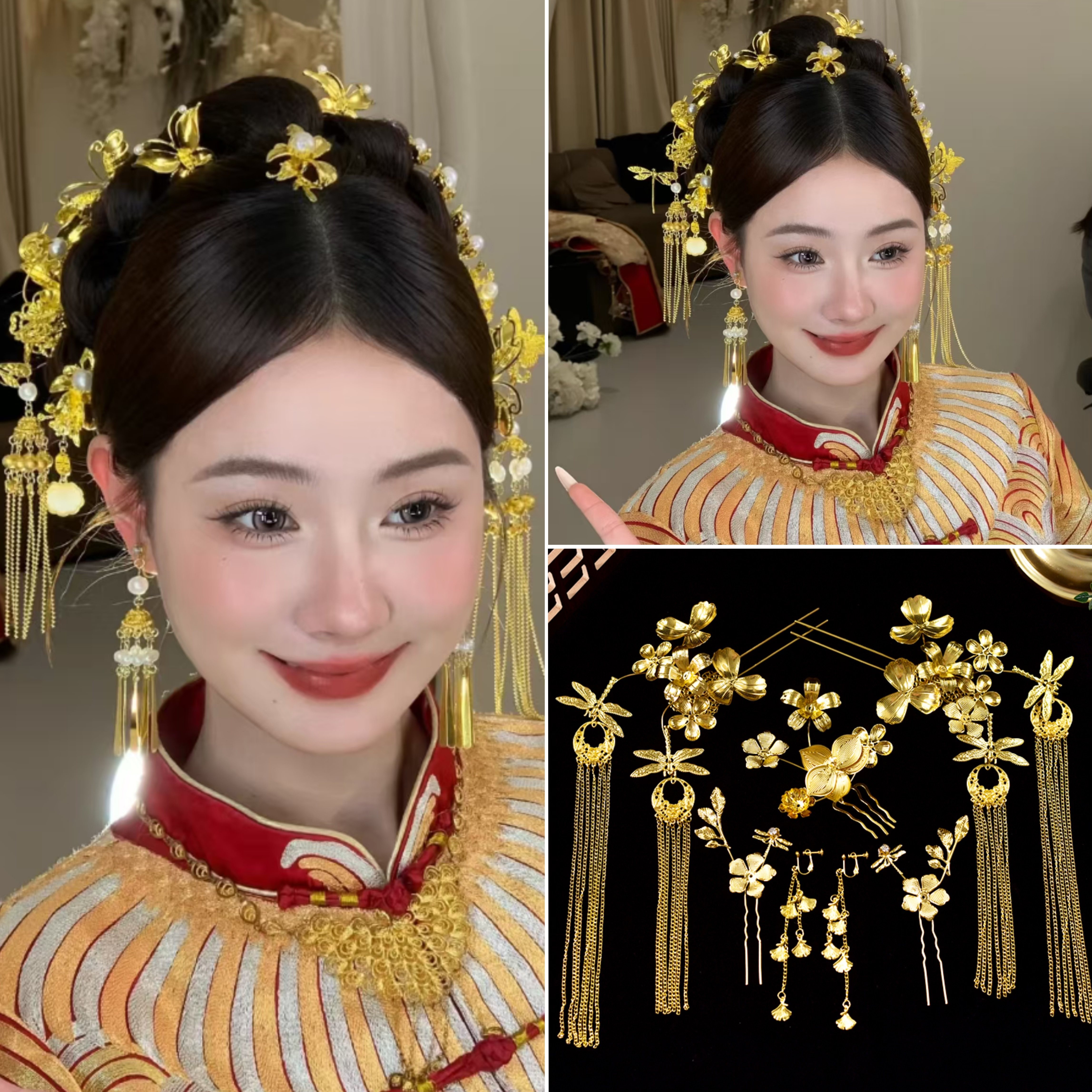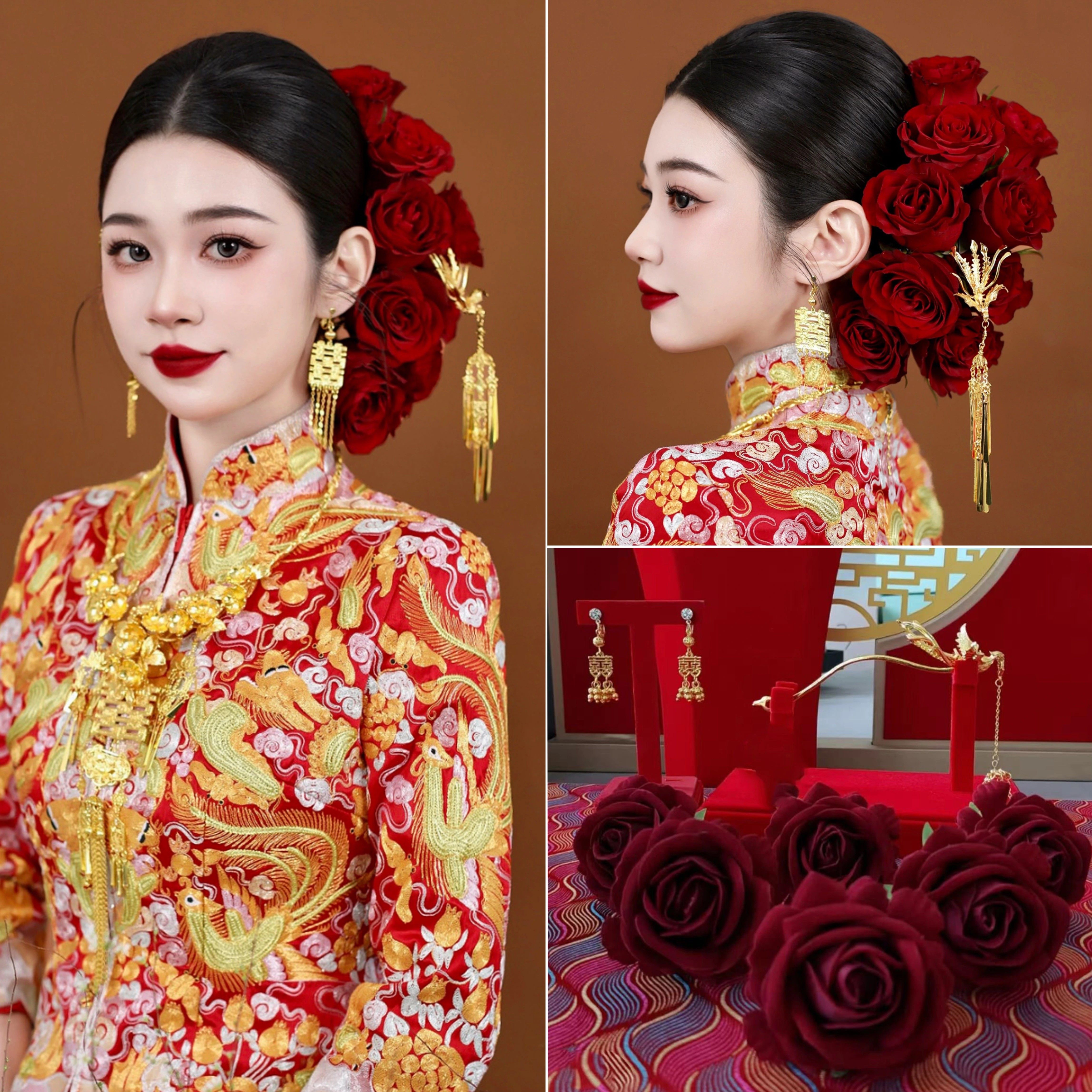 新中式订婚盘发头饰新娘红色玫瑰花龙凤褂金色头饰女古风配秀禾服