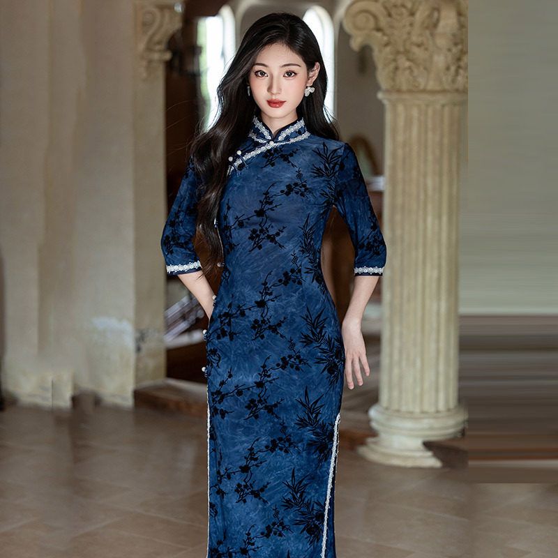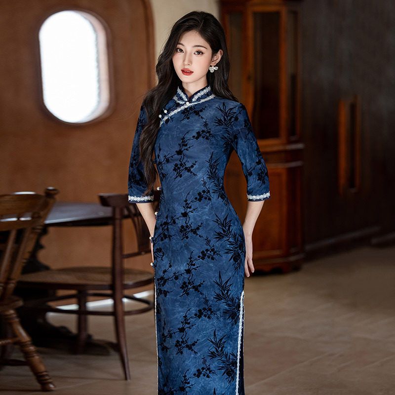 爱旗秋季长款收腰复古蓝色国风新中式七分袖旗袍年轻春秋改良修身