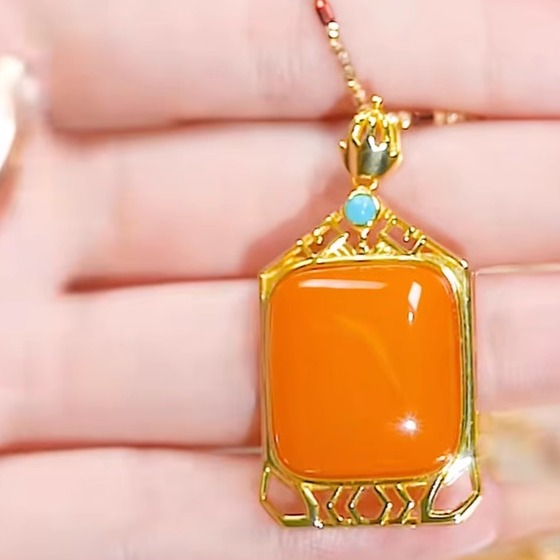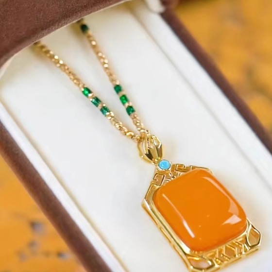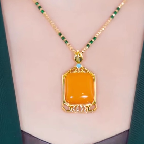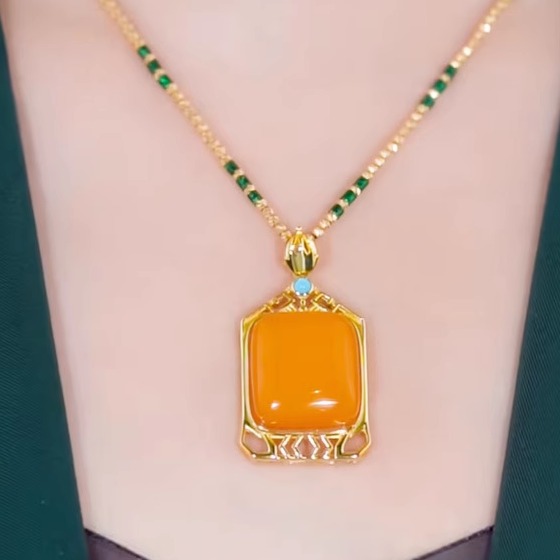 奥特莱斯折扣撤柜清仓新款无事牌吊坠黄蜜蜡吊坠女款纯银镶嵌项链
