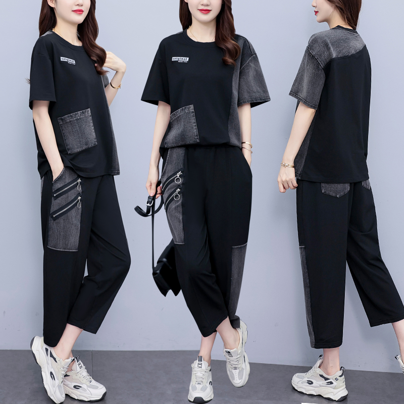 2025夏季设计感休闲时尚套装胖MM宽松拼接牛仔短袖两件套大码女装