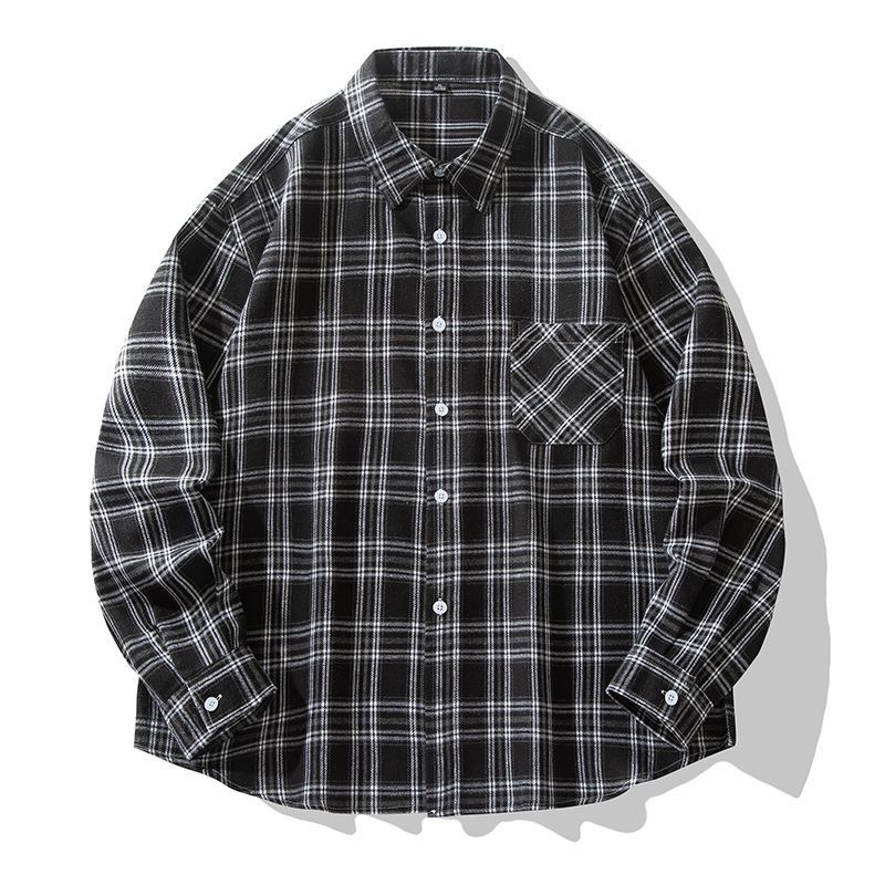 翻领+格子+长袖+美式+百搭+衬衫
