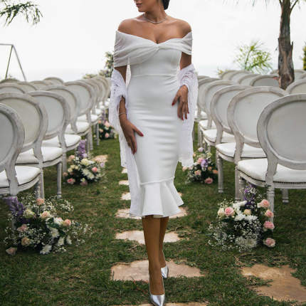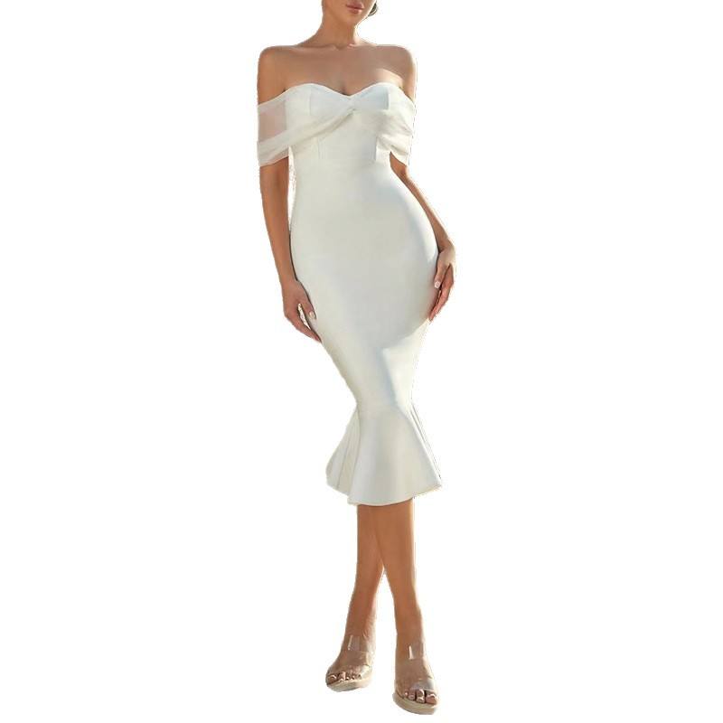 新款 法式婚纱敬酒服一字领网纱拼接款鱼尾裙夏季连衣裙女涤纶