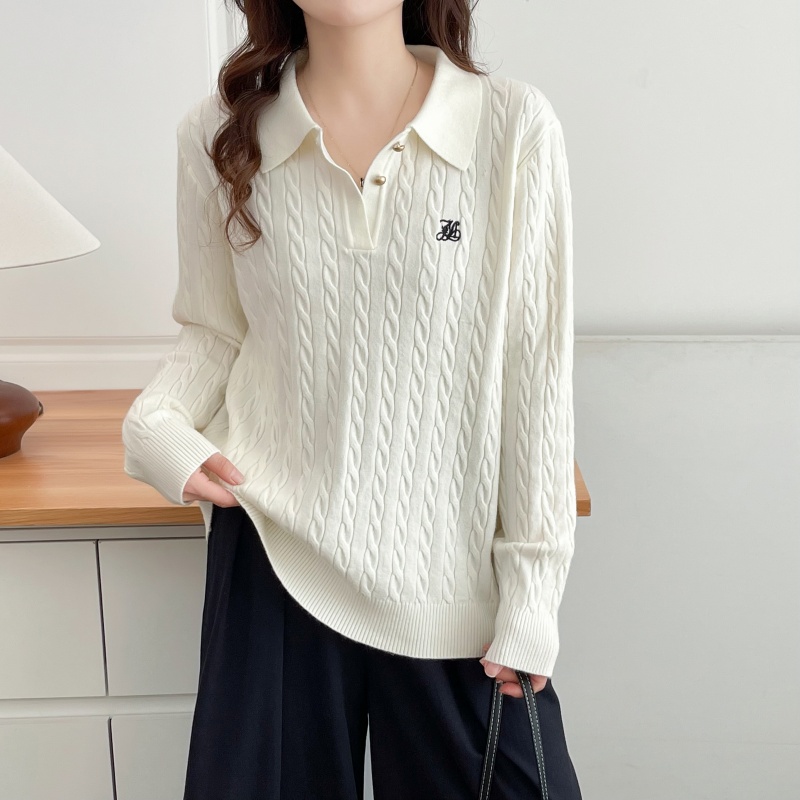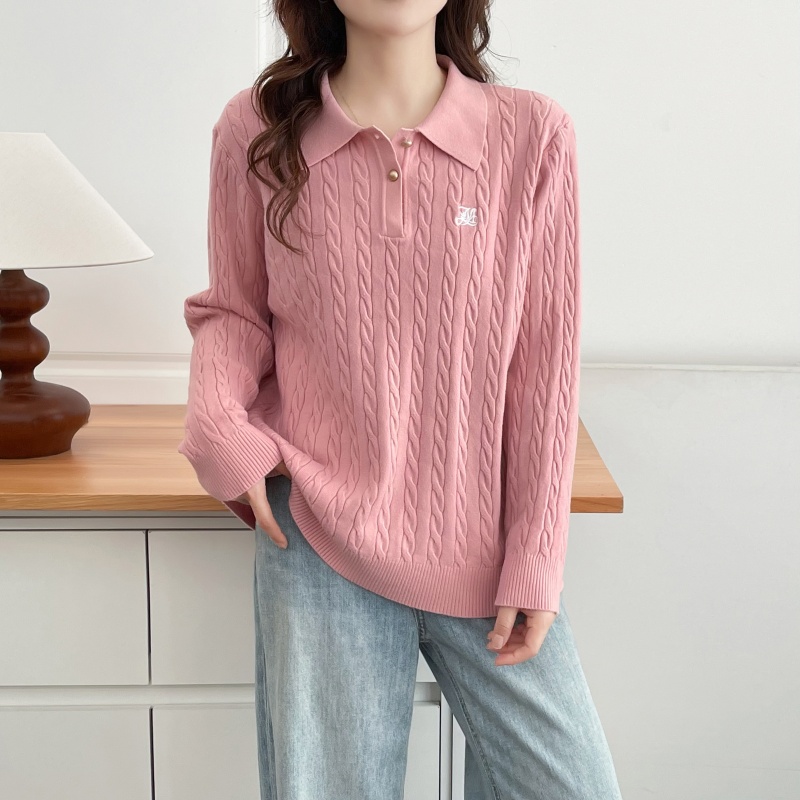 秋季新款大码女装设计感复古麻花毛针织衫学院风Polo领刺绣上衣