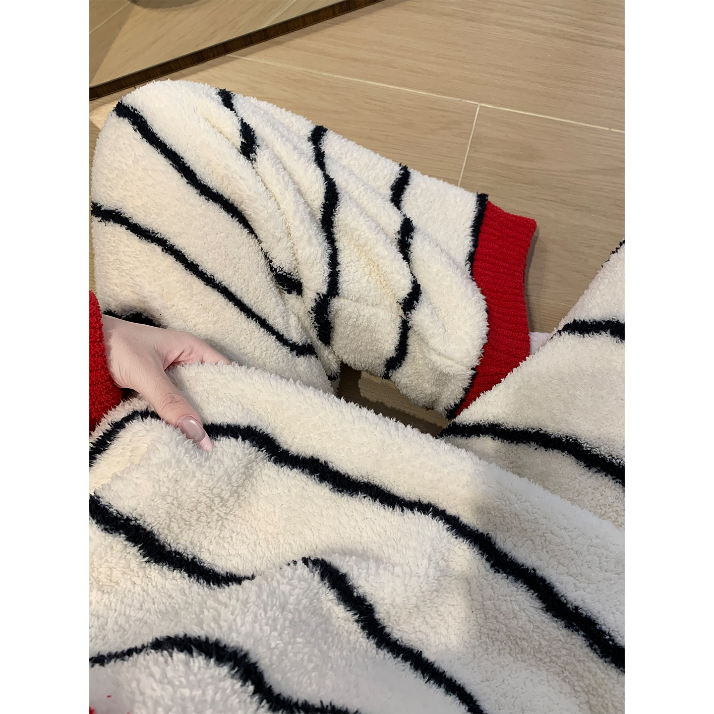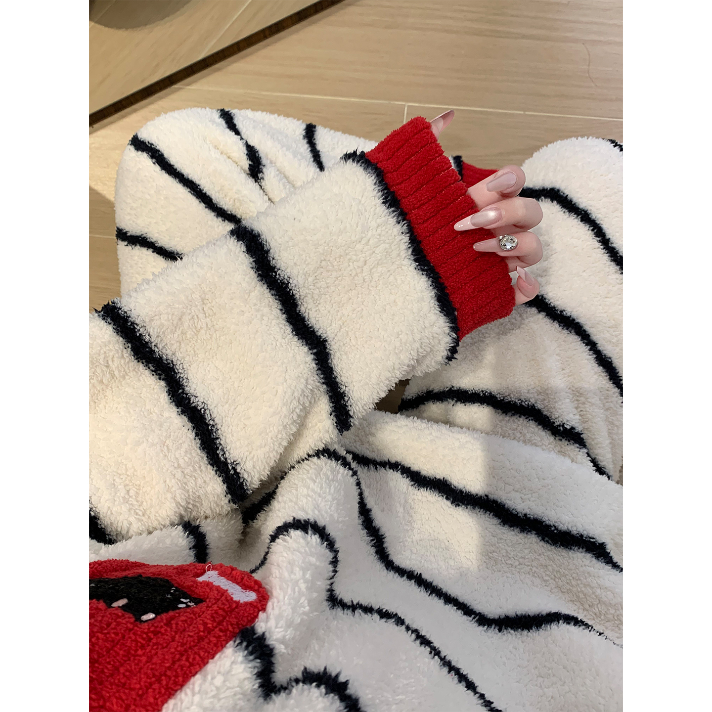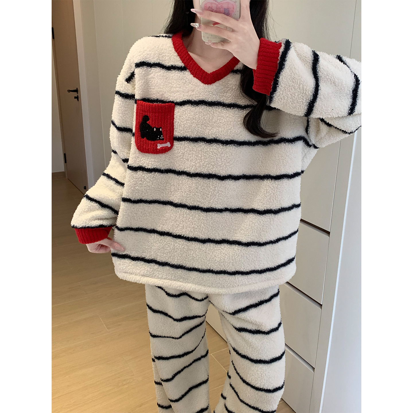 梦鸾半边绒睡衣女款秋冬季加厚加绒珊瑚绒简约风条纹可外穿家居服
