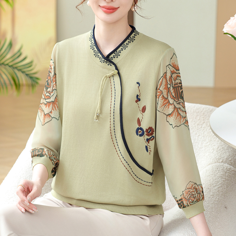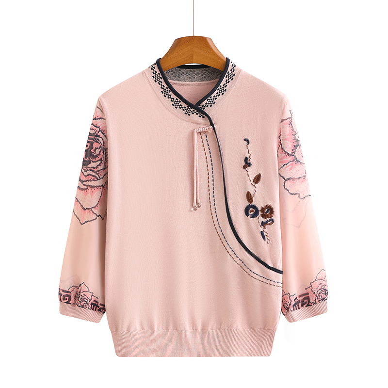 妈妈初秋七分袖冰丝衫国风针织纱袖上衣特大码中老年女装宽松T恤