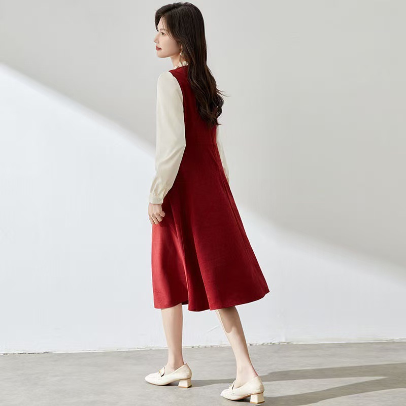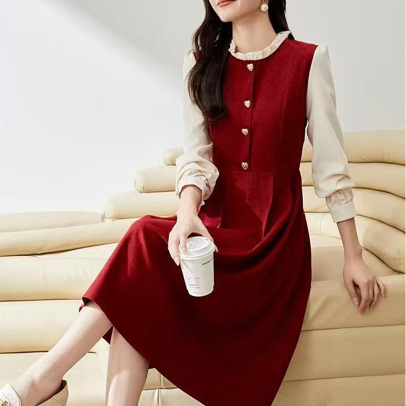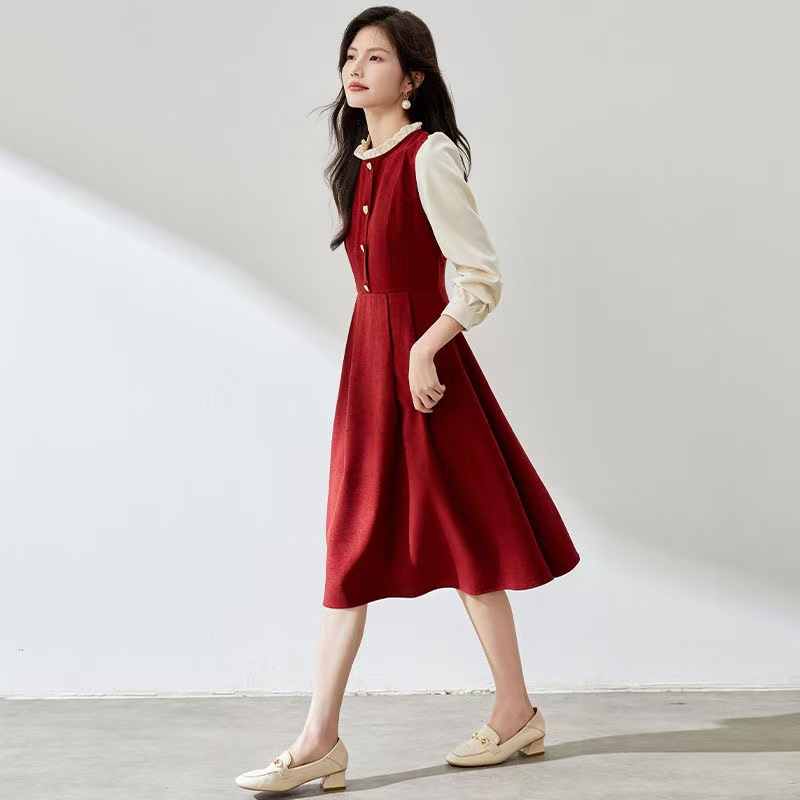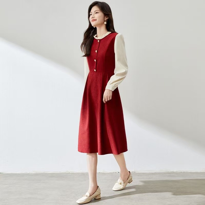 法式赫本香风红色2025秋冬新款复古气质长袖连衣裙拼接假两件裙子