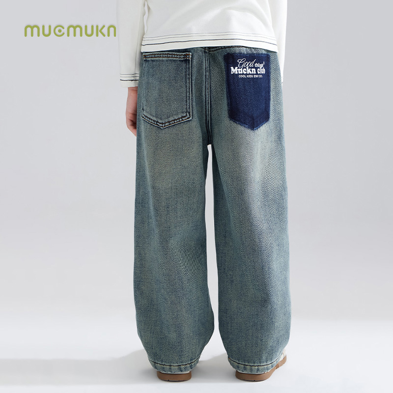 【厚实加绒】复古水洗猫须牛仔裤直筒儿童口袋印花冬季加厚裤子