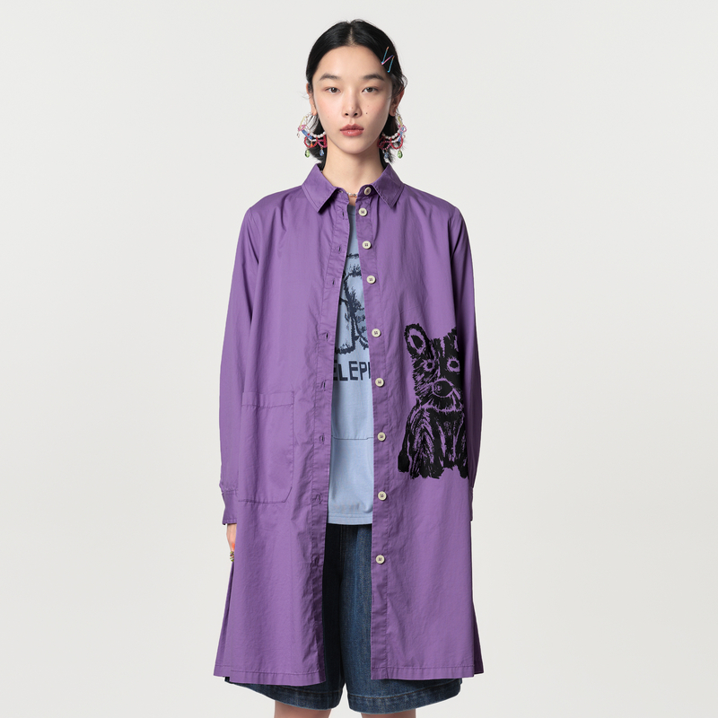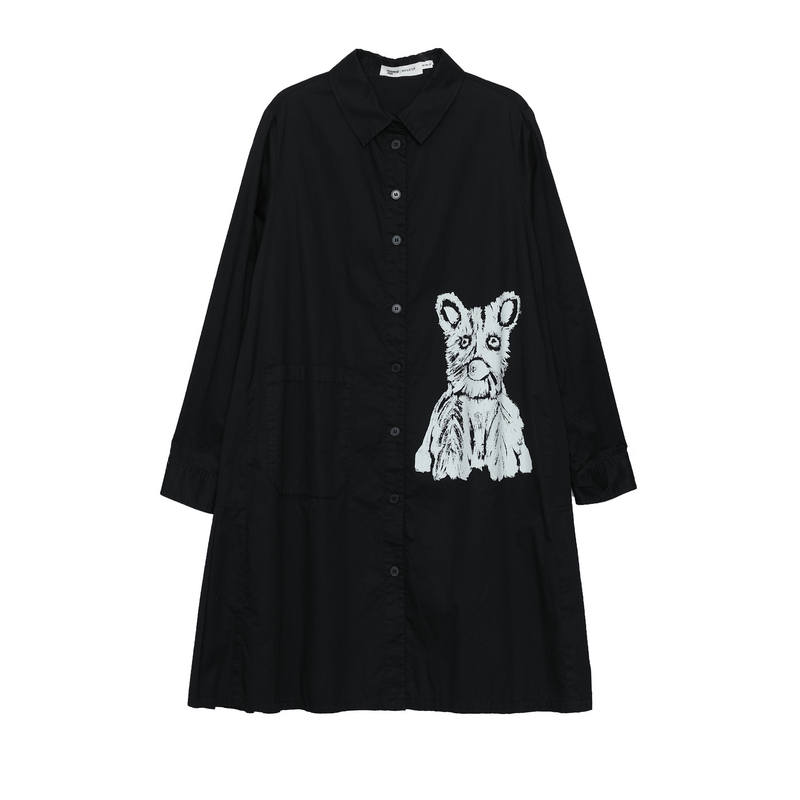 MOVEUP幻走2024春季新款.FUN系列翻领压褶小狗印花纯棉衬衫连衣裙