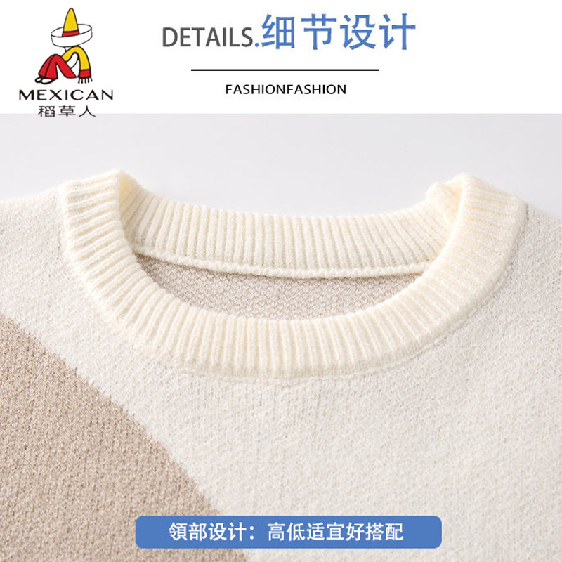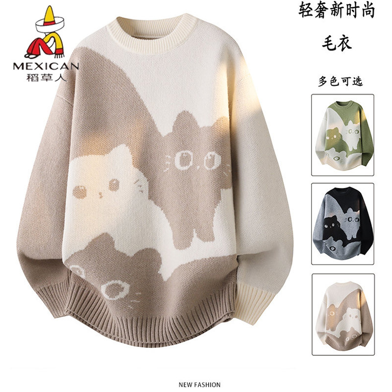 稻草人2025秋冬季新款男款复古圆领潮猫头休闲韩版加厚毛衣针织衫