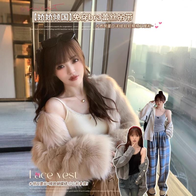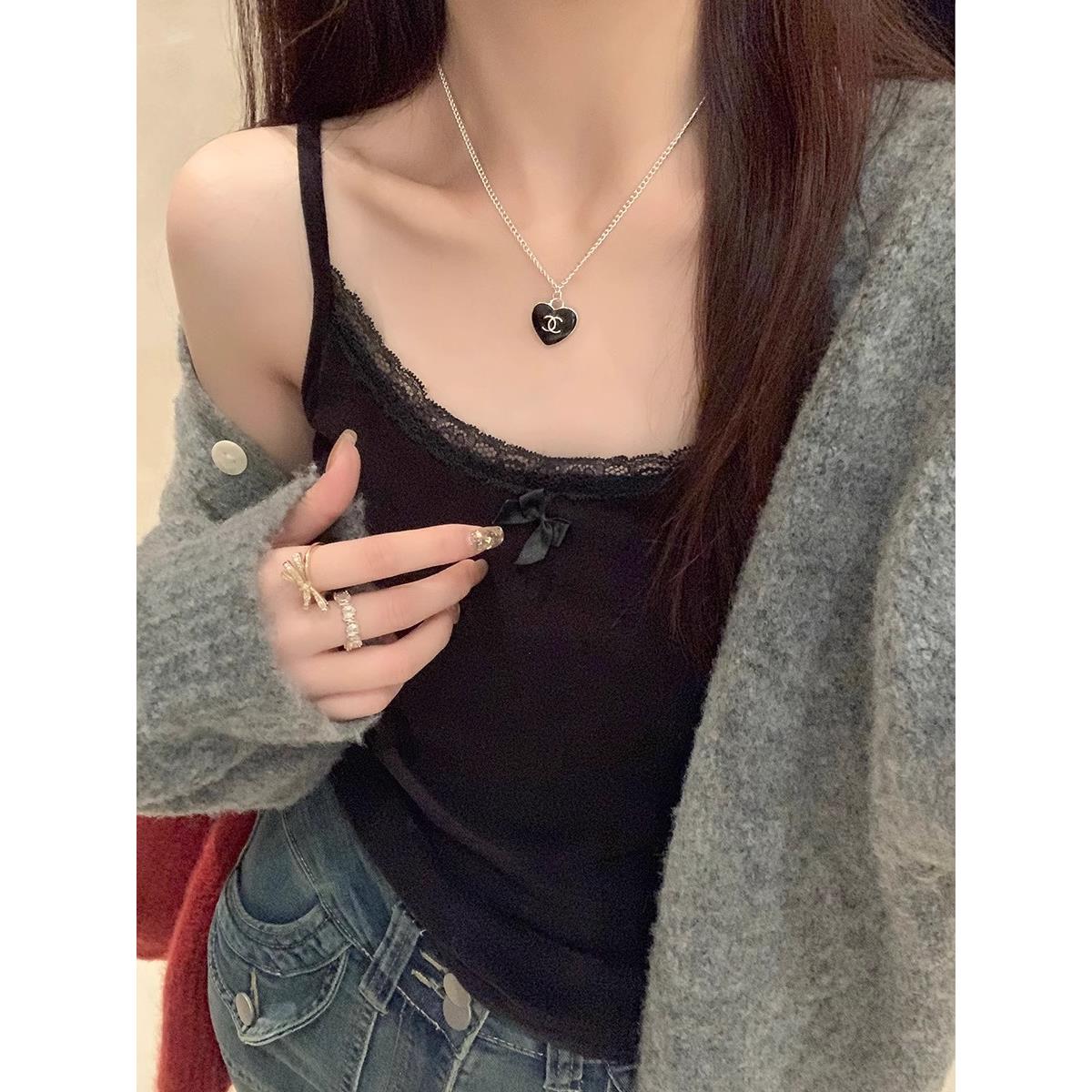 2025新款韩版蝴蝶结蕾丝吊带带胸垫小背心女夏外穿2024新款白色内