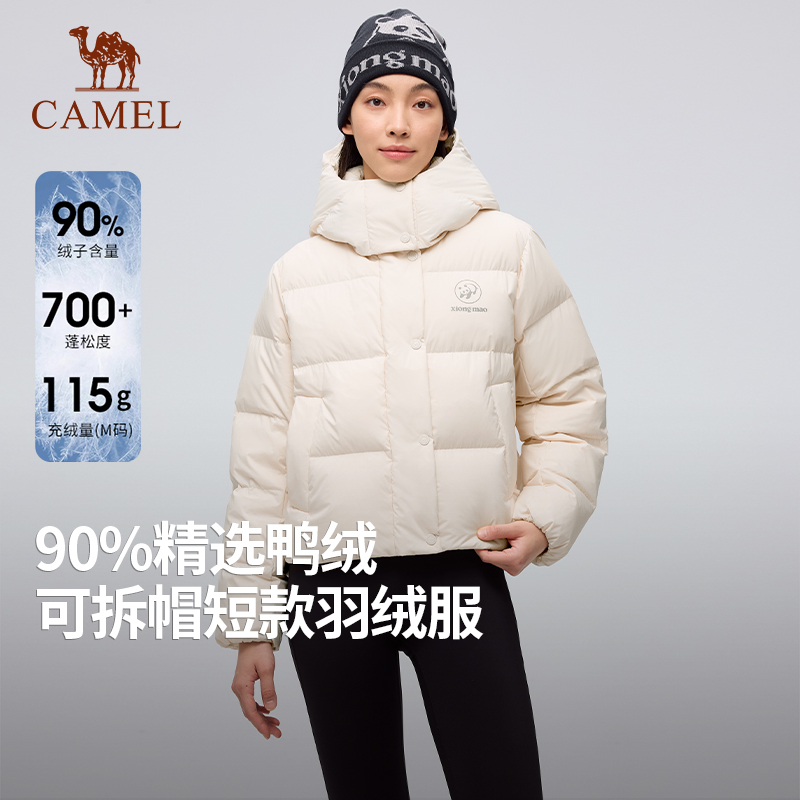 骆驼熊猫羽绒服女款短款户外2025新款秋冬轻盈连帽面包服保暖外套