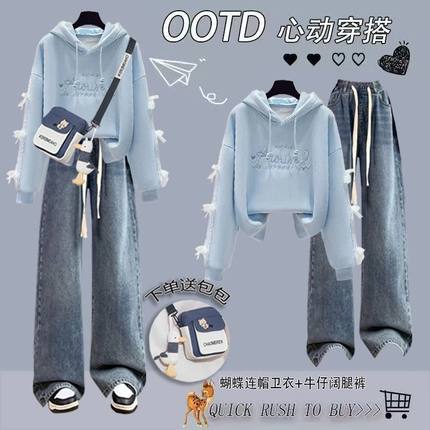 送包2025秋冬套装女学生小清新加绒连帽卫衣休闲洋气牛仔裤两件套