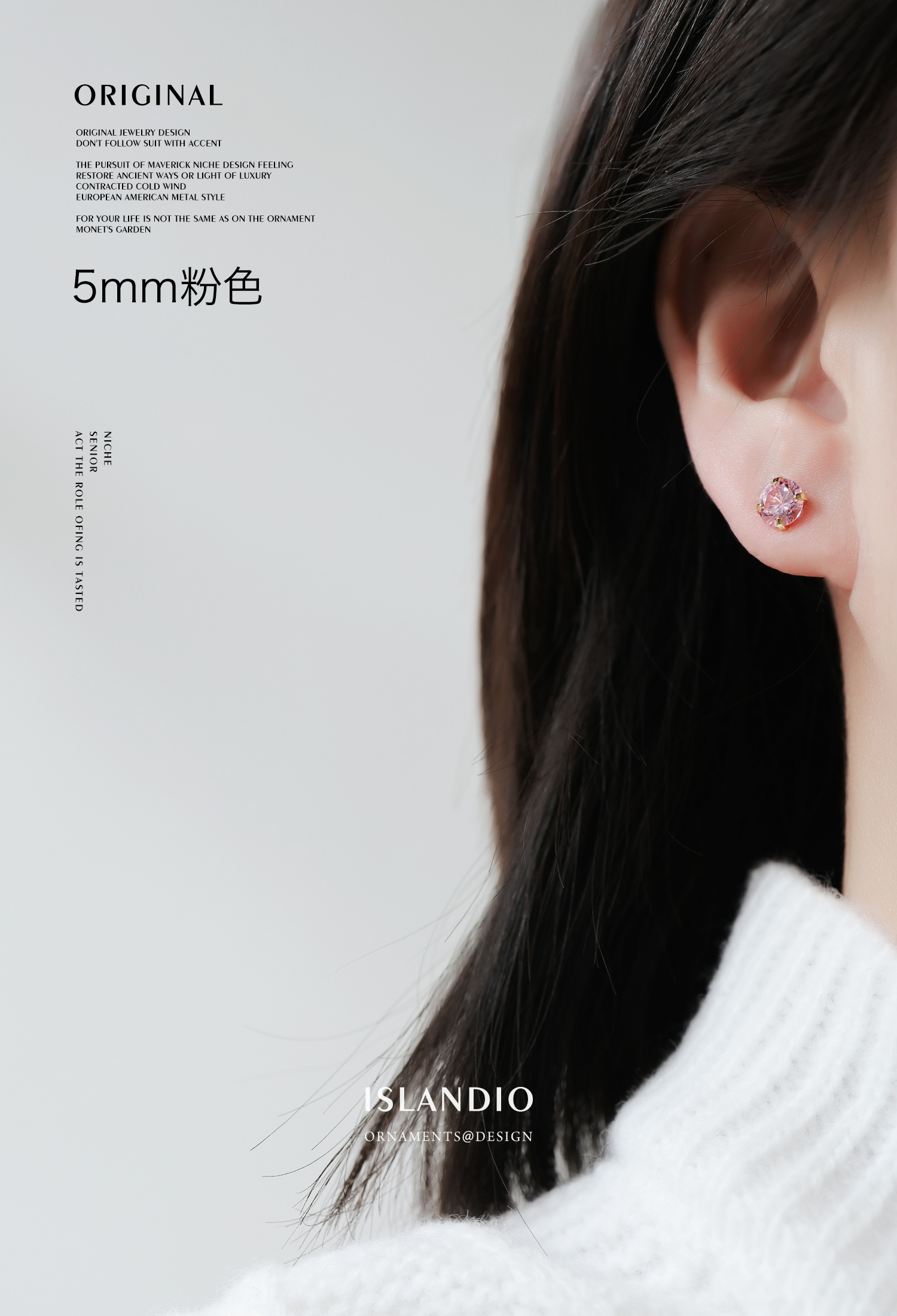ISLANDIO迷你3mm粉水晶钻石简约18K金银耳钉精致小巧养耳朵耳饰女