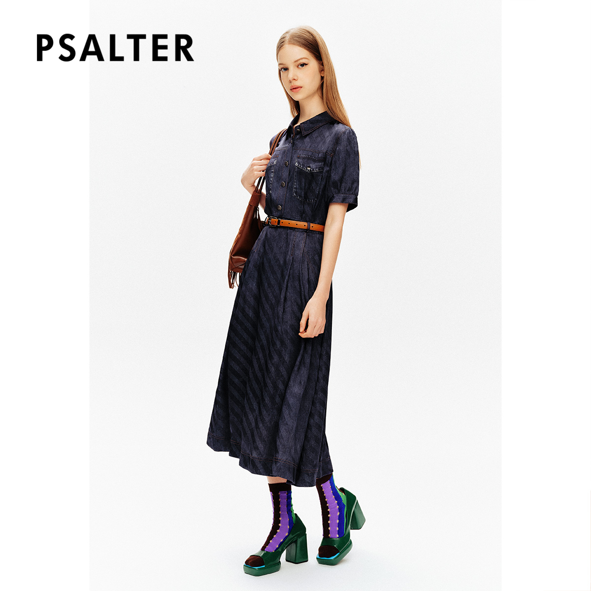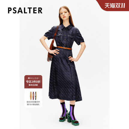 【真丝】PSALTER诗篇100%桑蚕丝暗纹提花牛仔衬衫裙连衣裙夏