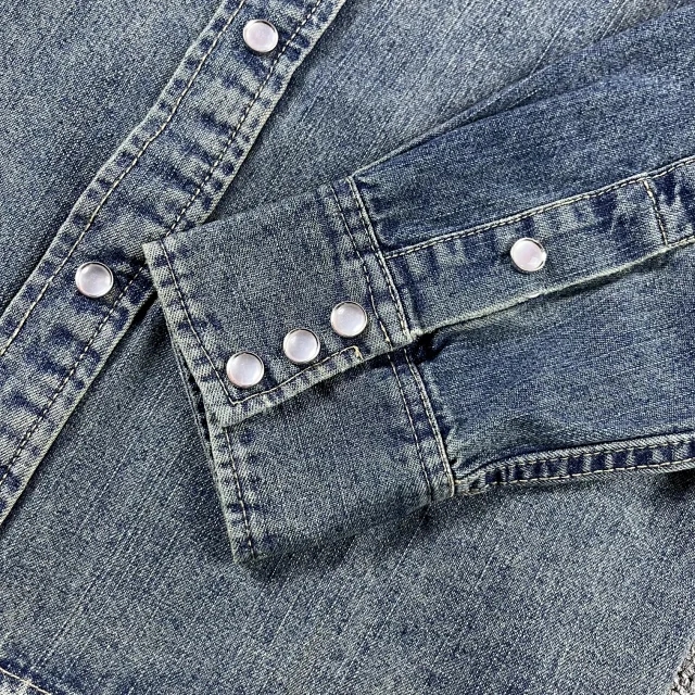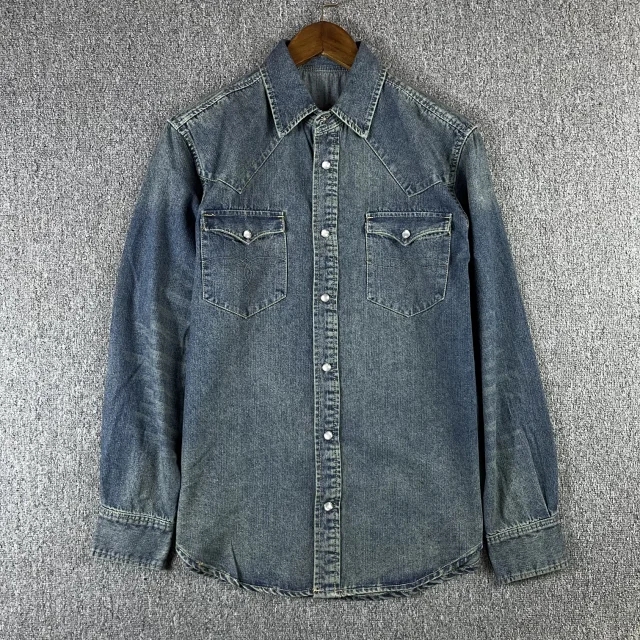 无领标经典款牛仔衬衫男士复古水洗做旧磨白RRL西部长袖衬衣