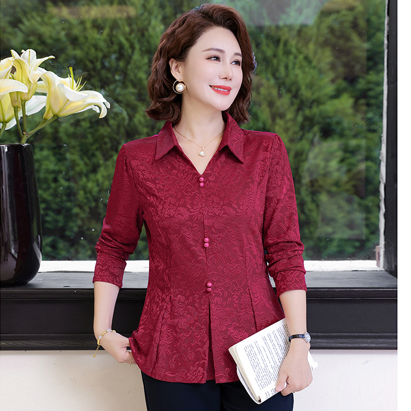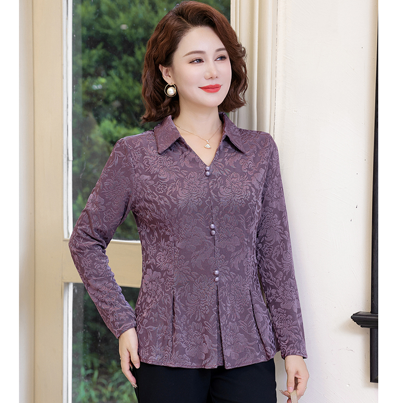 中老年时尚女装气质减龄妈妈春装t恤小衫百搭翻领时尚长袖上衣服