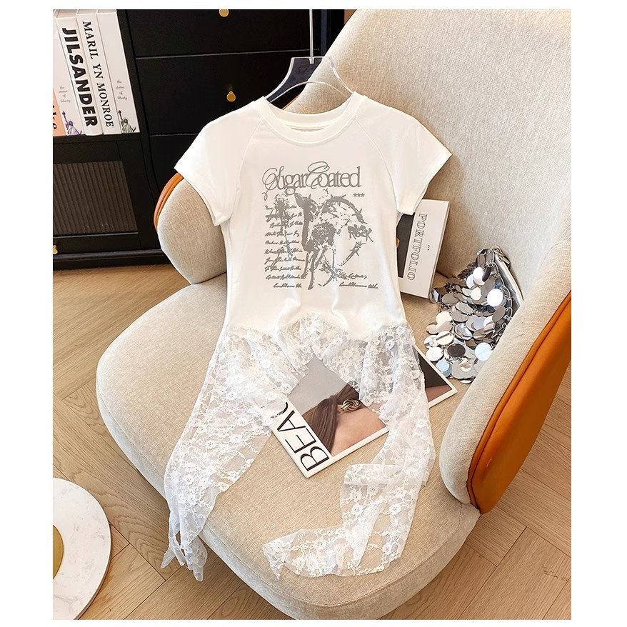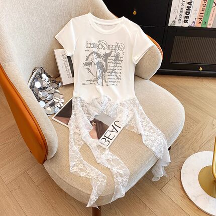 2025夏季新款时尚辣妹蕾丝拼接短袖t恤女不规则独特别致漂亮上衣