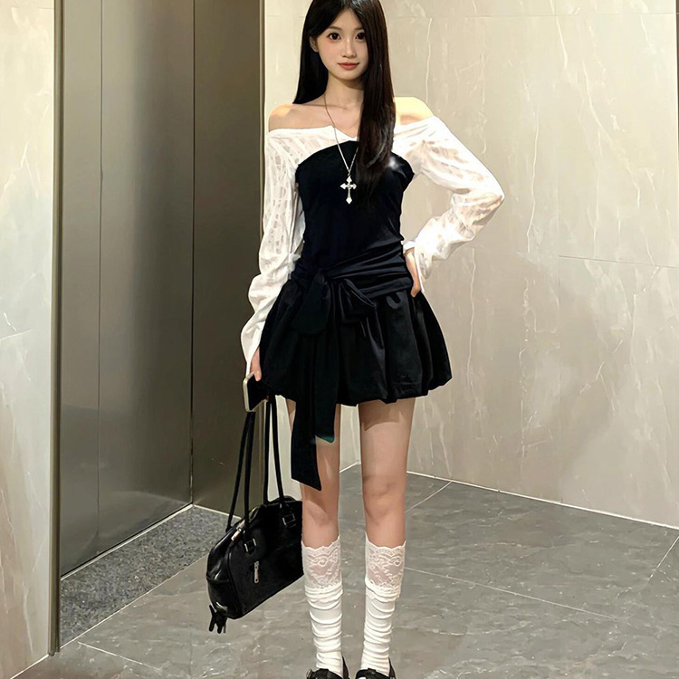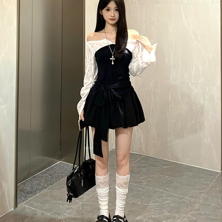 秋季新款韩系设计感小众假两件一字肩蝴蝶结系带上衣黑色半裙套装
