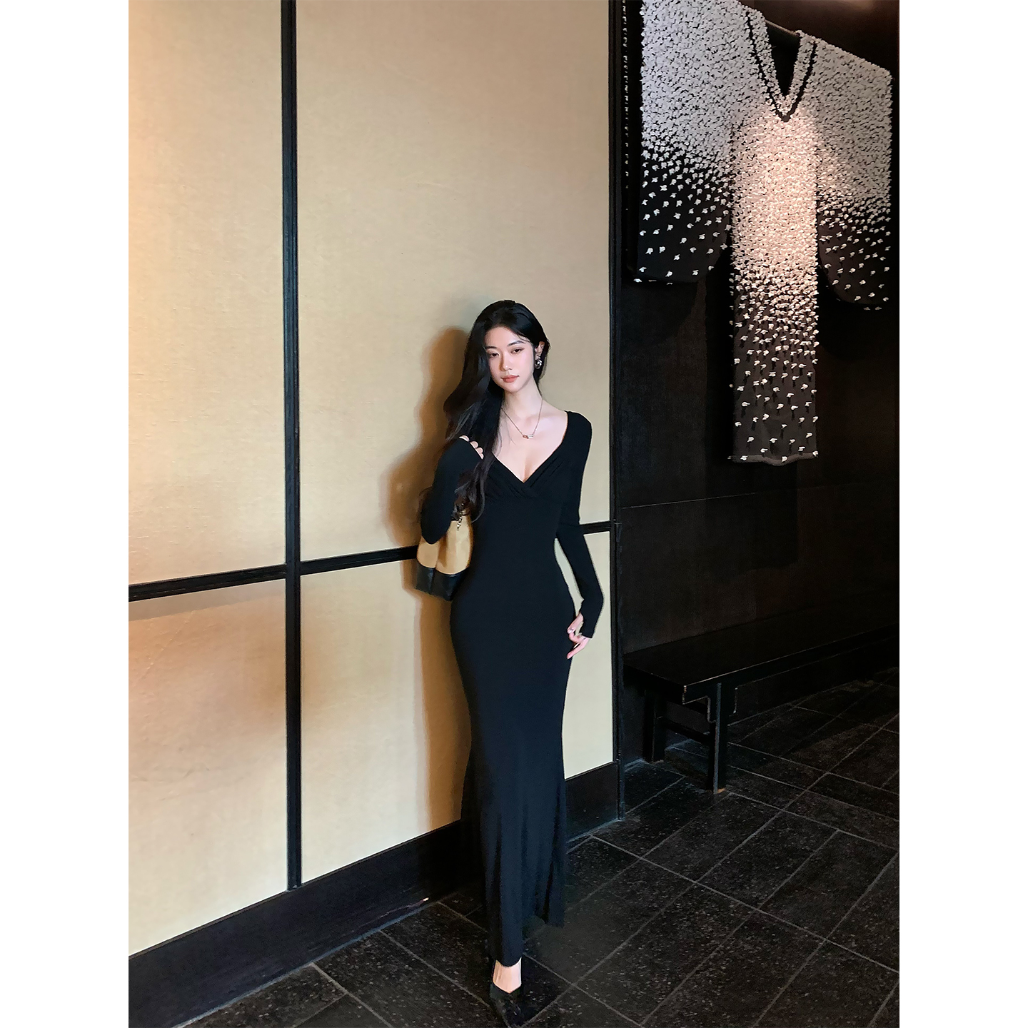 Norain不下雨 黑色性感V领针织包臀裙女秋绝美气质收腰长袖连衣裙