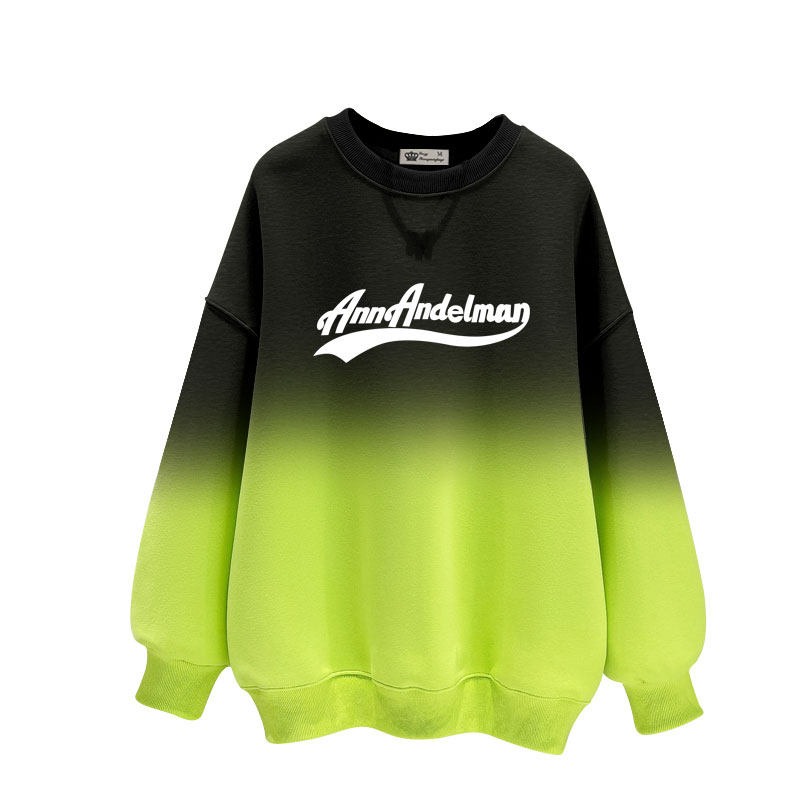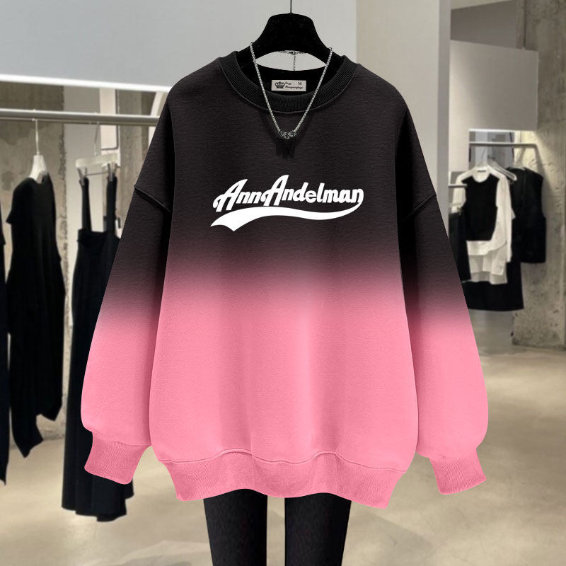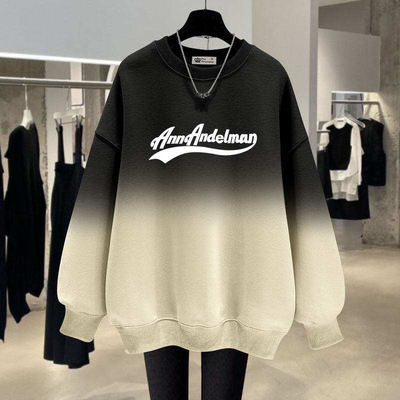 2025春秋冬季简约字母中长款加绒加厚宽松套头渐变色圆领卫衣女潮