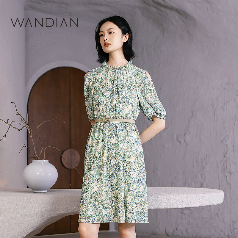 婉甸国风绿花色短袖连衣裙夏季宽松小立领荷叶边