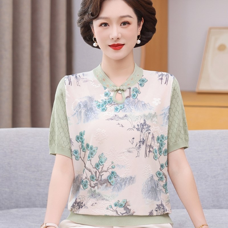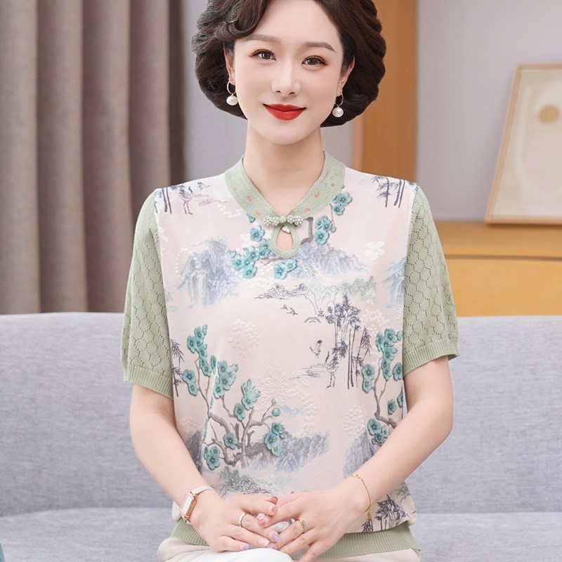 洋气妈妈夏装新款新中式真丝短袖冰丝T恤中老年女时尚套装上衣服