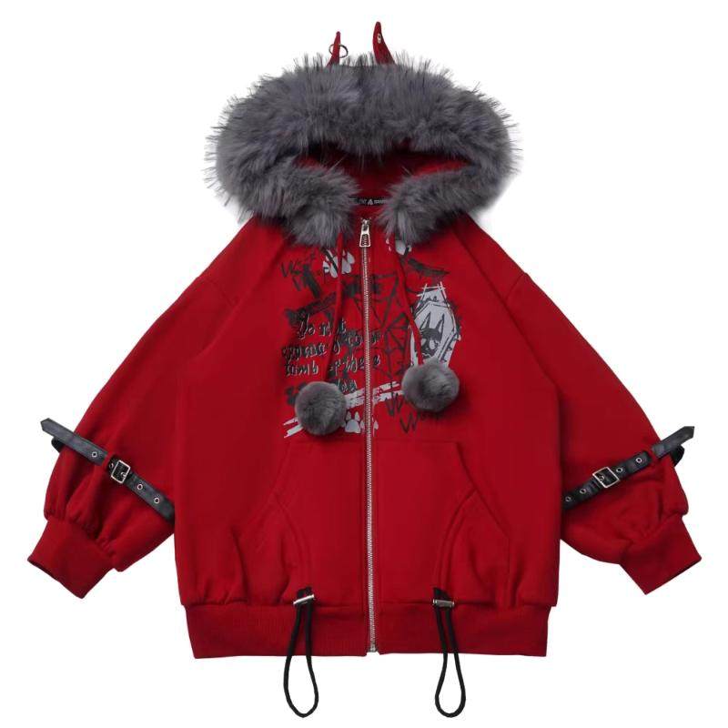 pinksavior【恶犬症】红色新年特别版毛球加绒外套内搭半裙