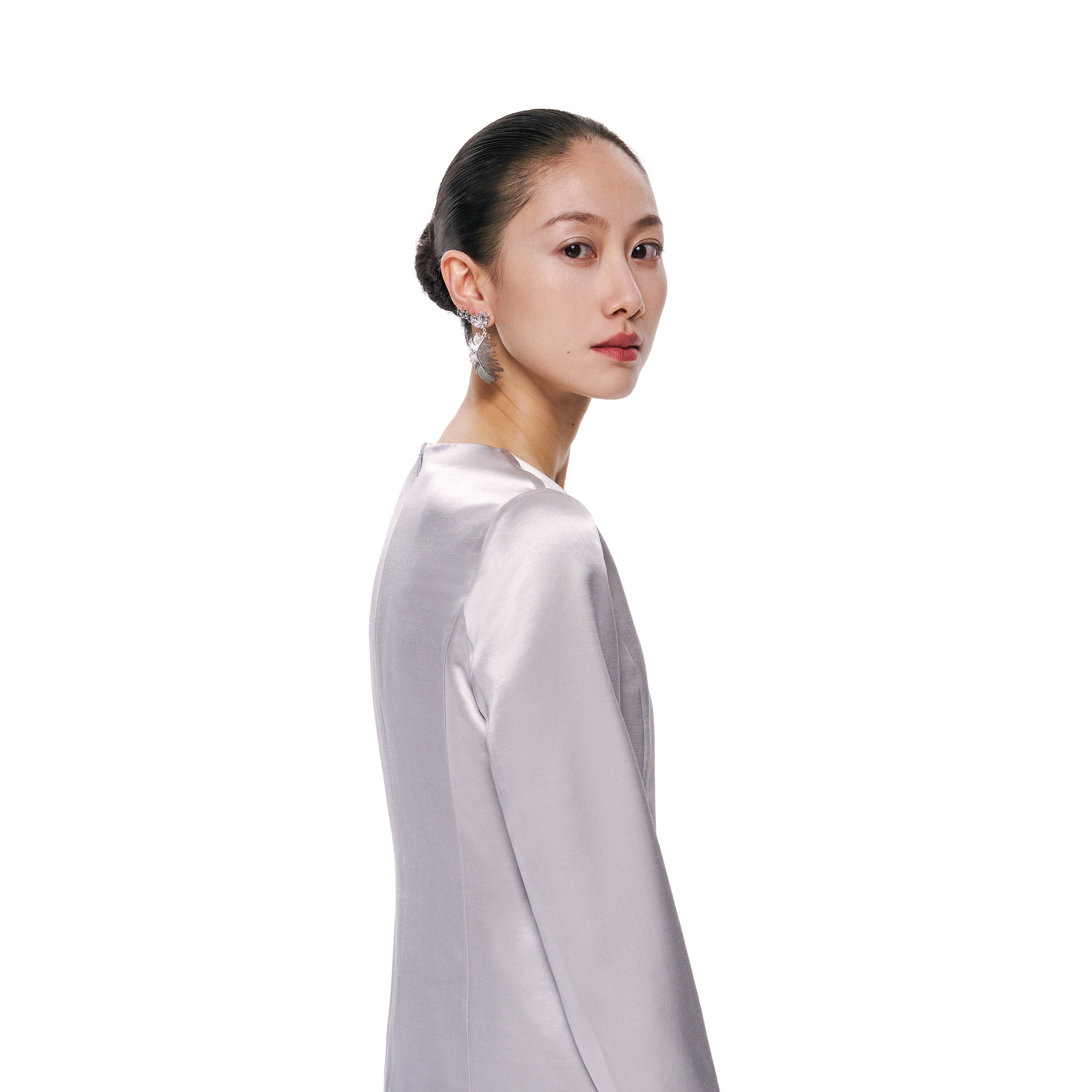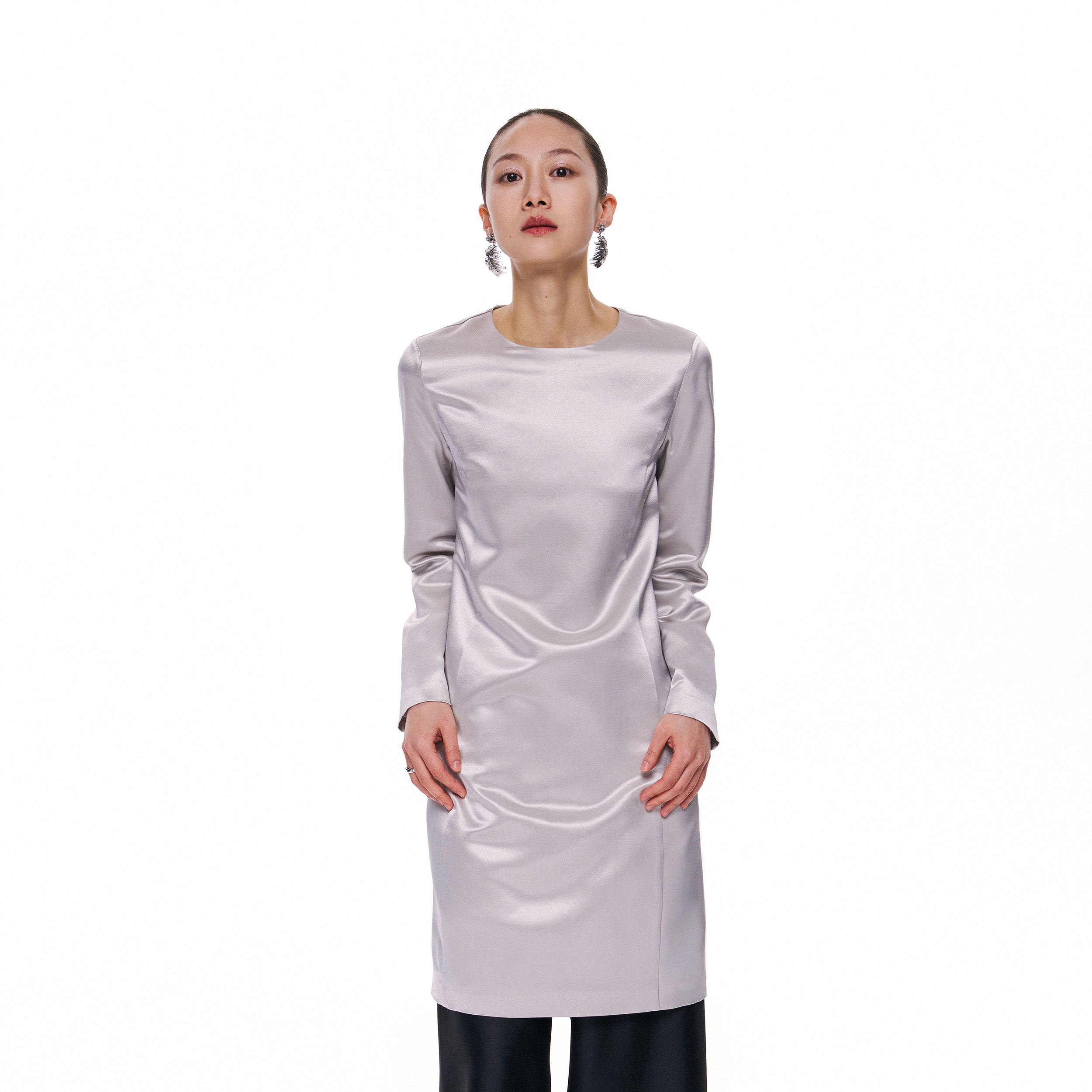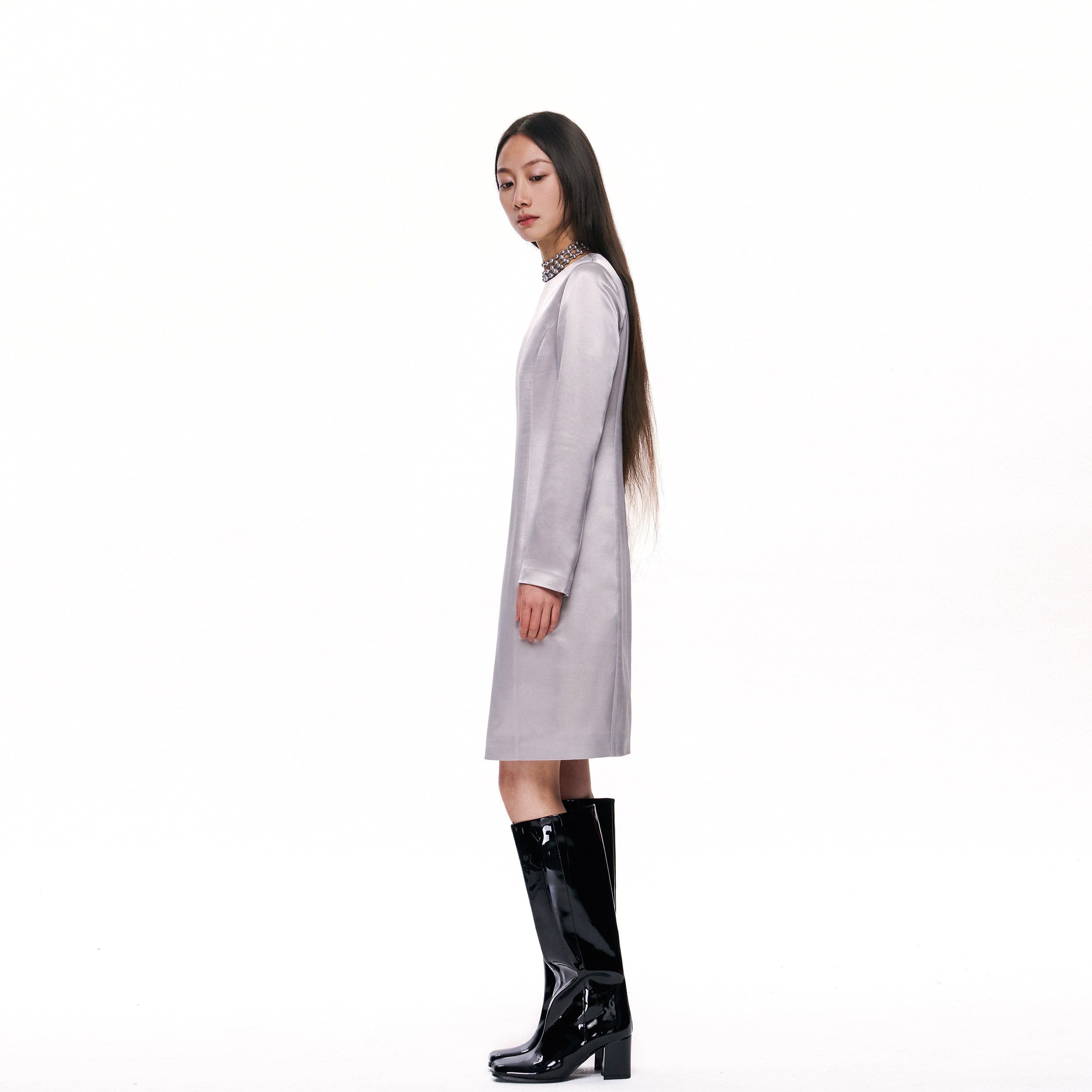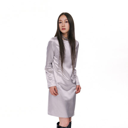 林乔芝2025年春季新款真丝羊毛连衣裙高级灰圆领气质长袖丝毛中裙