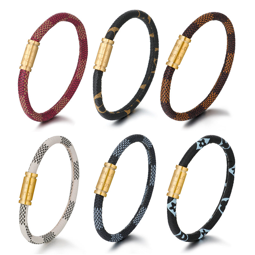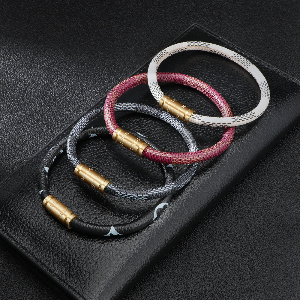 跨境电商欧美钛钢刻字老花色牛皮绳手链不锈钢磁扣男女情侣手环