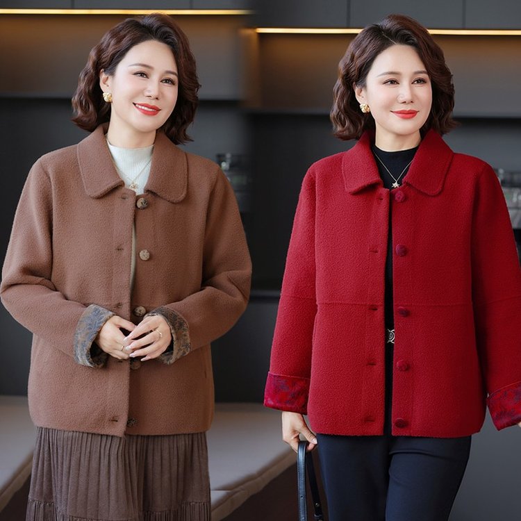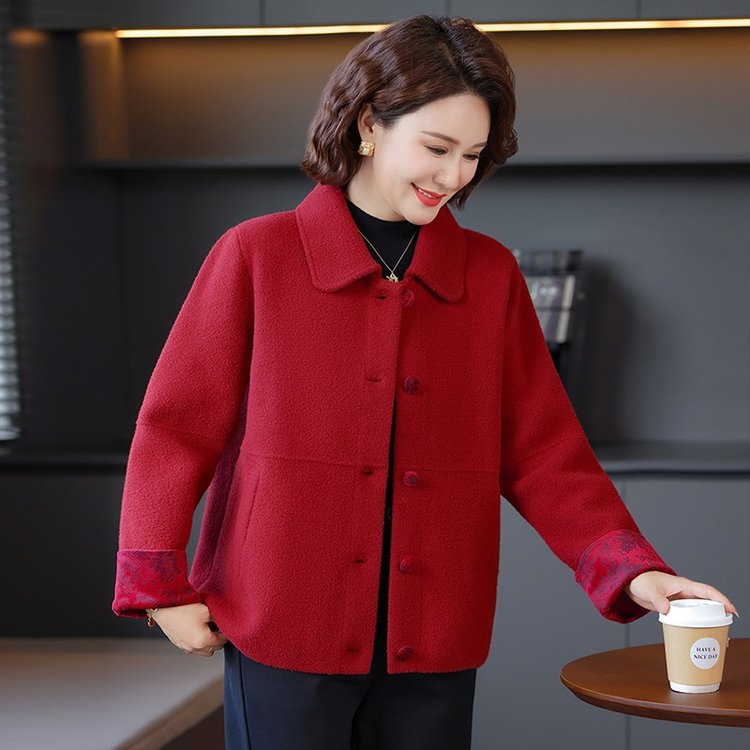 新中式妈妈冬装外套洋气毛呢上衣中老年女士喜庆红色高贵短款大衣