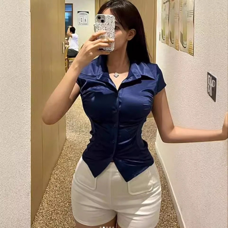 现货~韩国东大门性感翻领收腰短袖衬衫简约女人气质显瘦衬衣