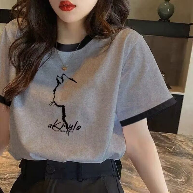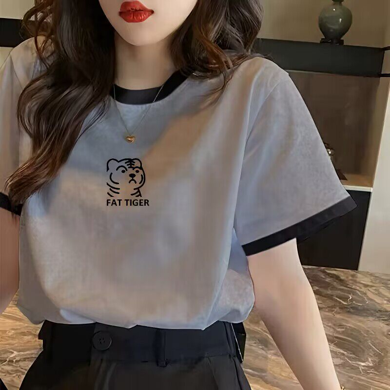 欧货短袖t恤女2025春夏季新款印花灰色宽松撞色减龄正肩纯棉上衣