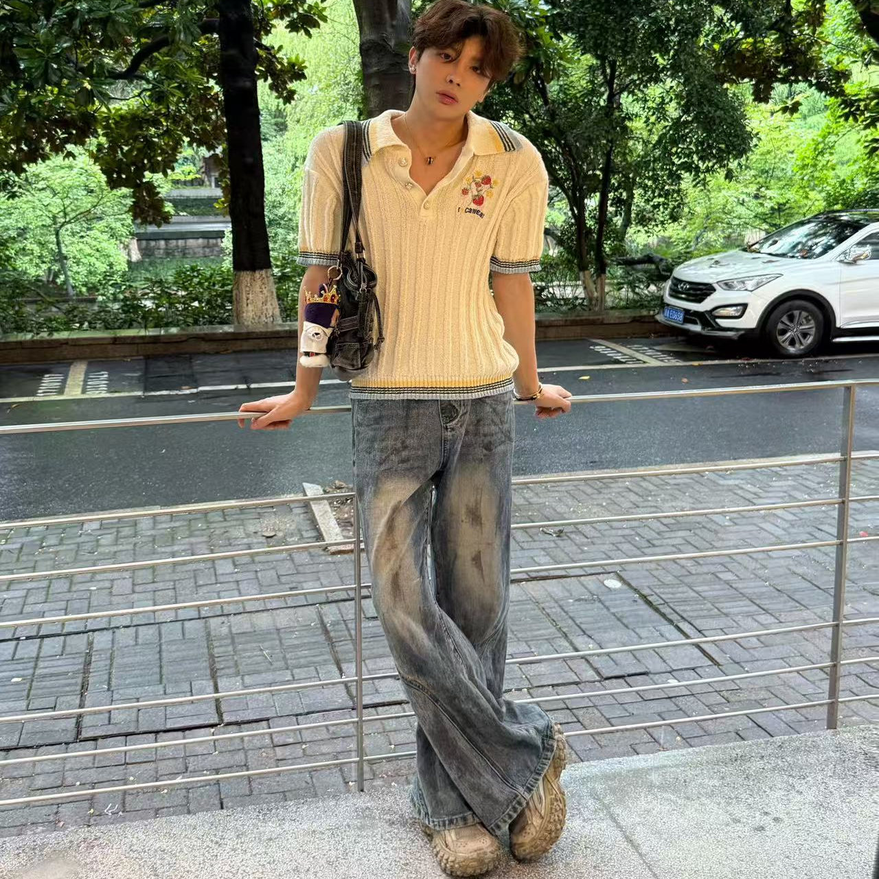美式复古针织短袖男女夏季珍珠扣刺绣polo衫t恤宽松休闲慵懒半袖
