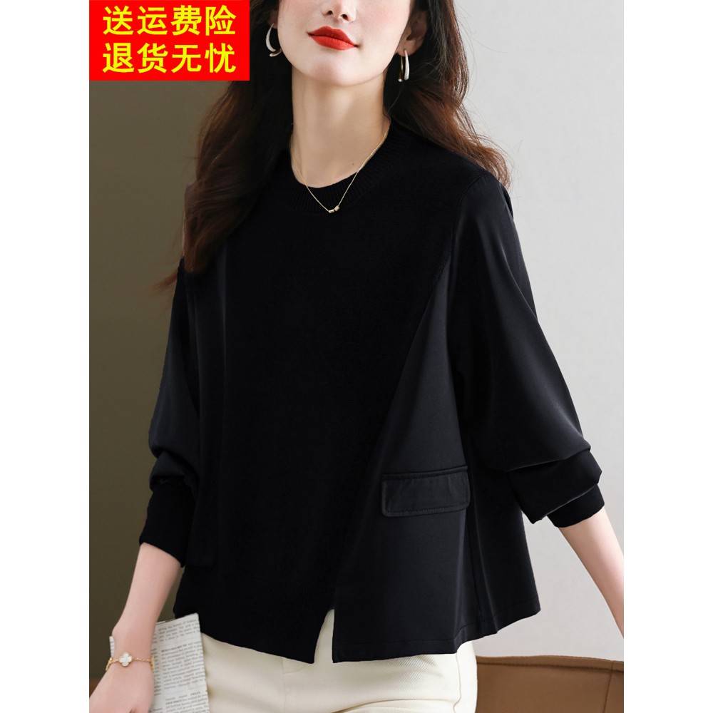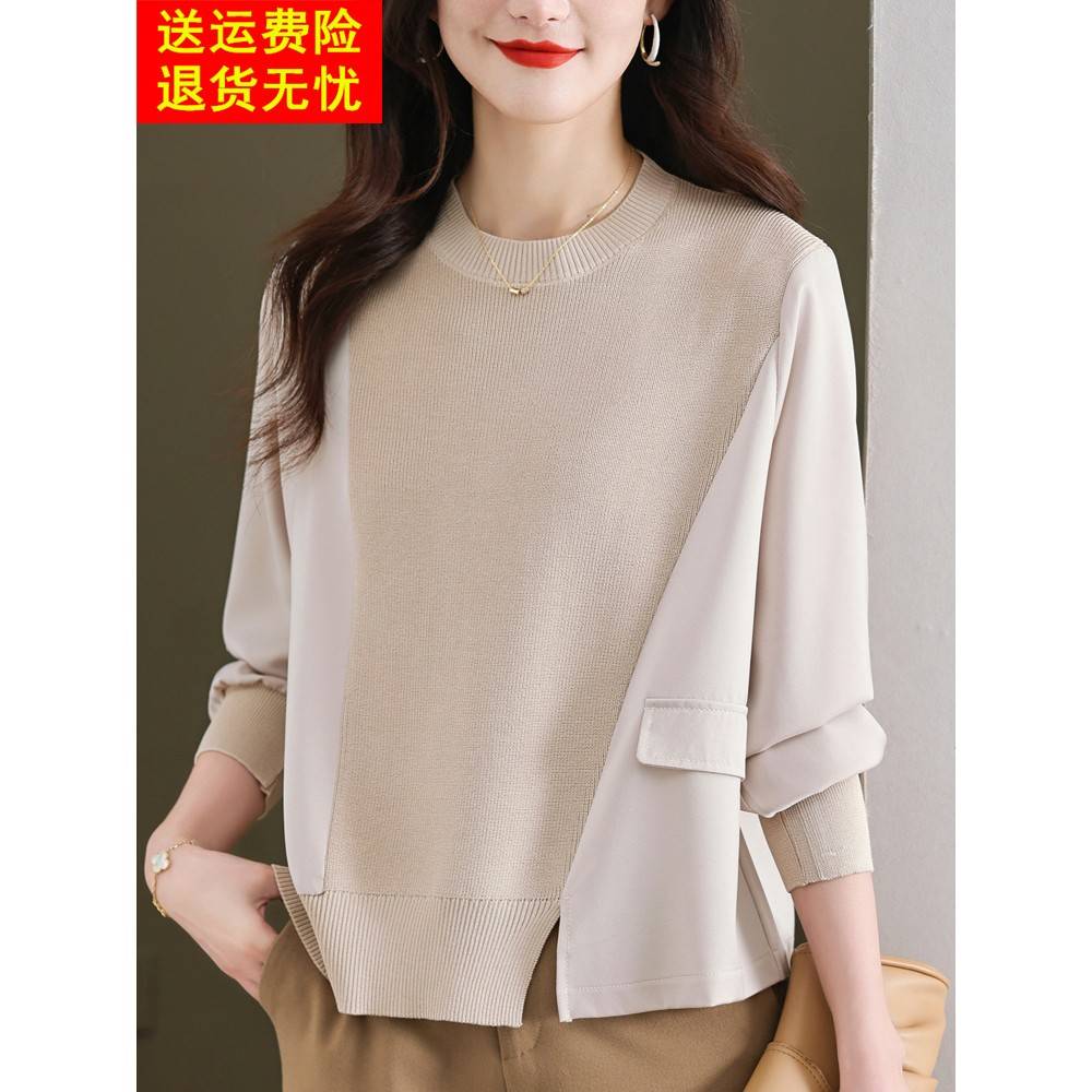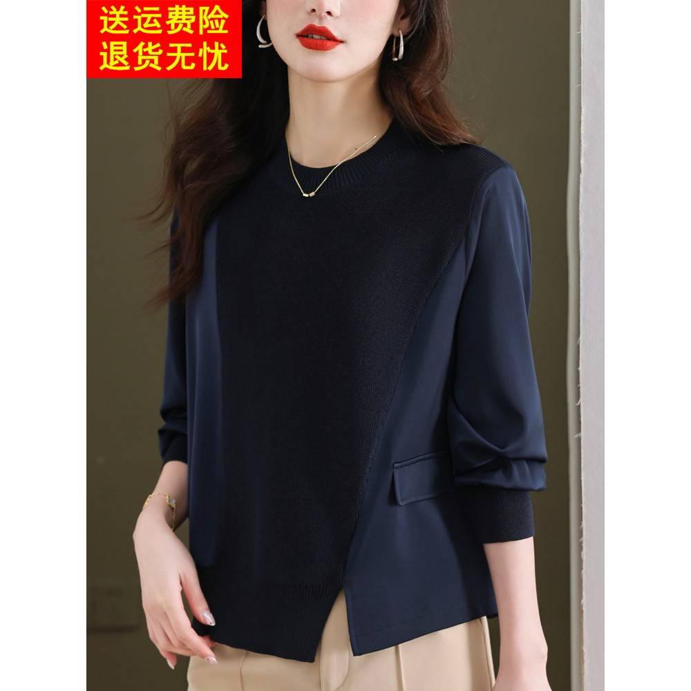 高端大牌桑蚕丝长袖t恤女时尚春装新款针织拼接洋气真丝上衣小衫