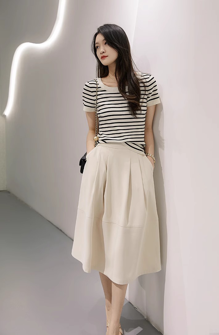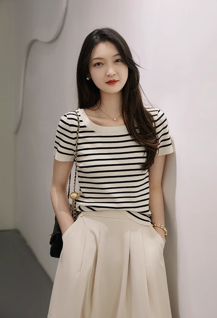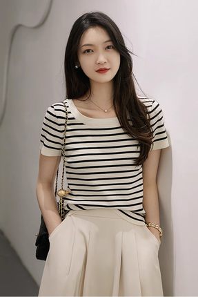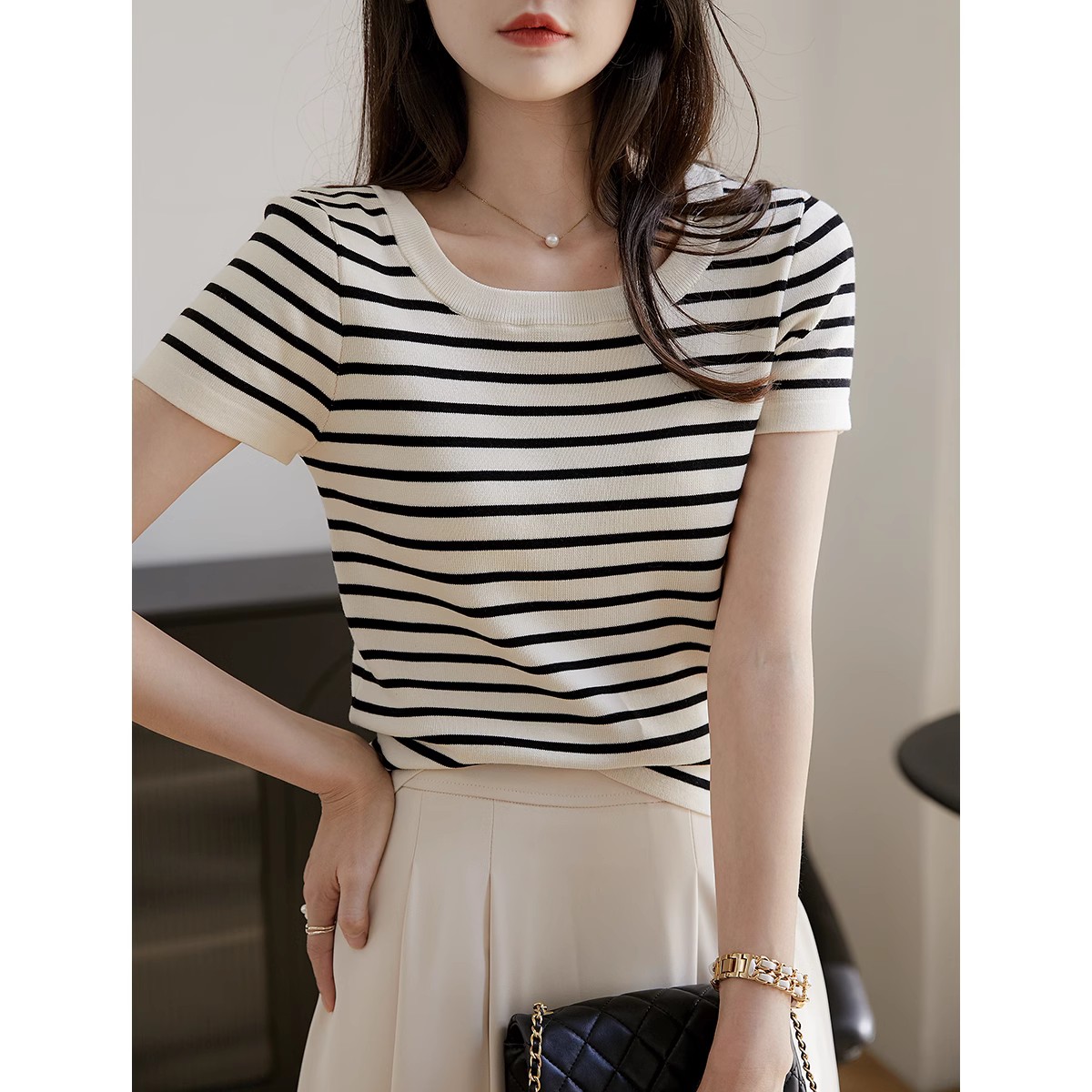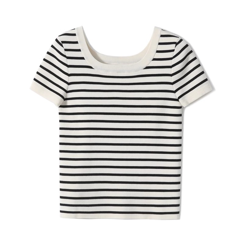 撞色条纹正肩短袖T恤女夏装新款美式复古修身显瘦小个字方领上衣