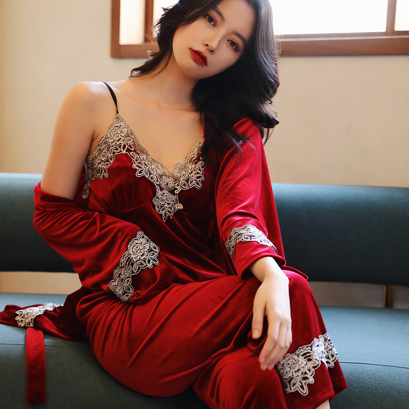 金丝绒四件套红色新娘晨袍家居服