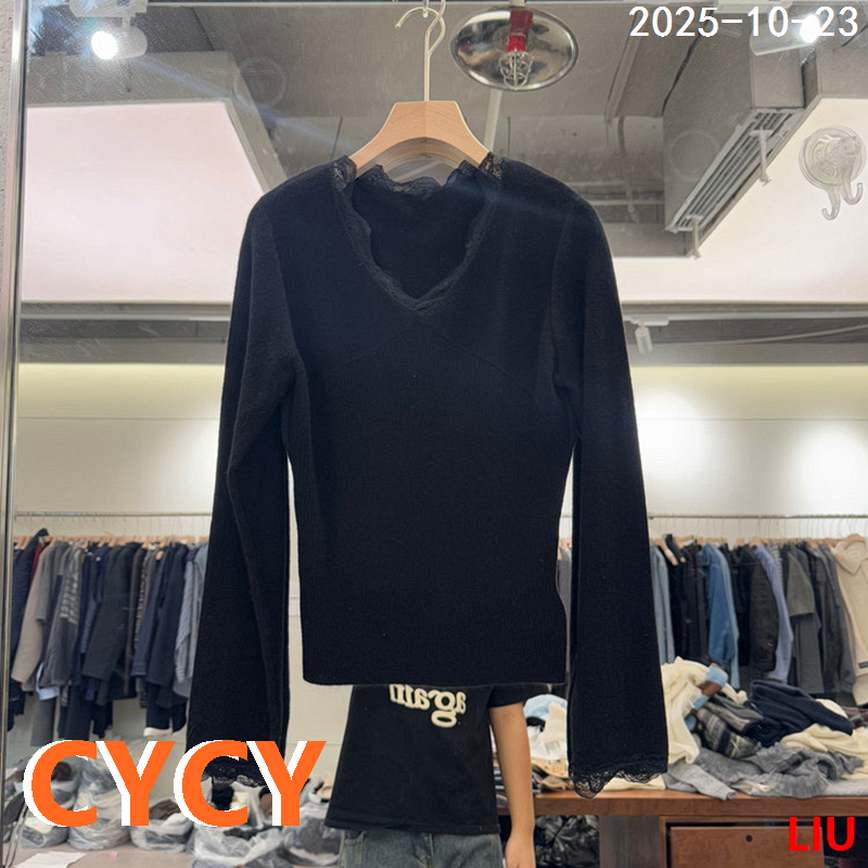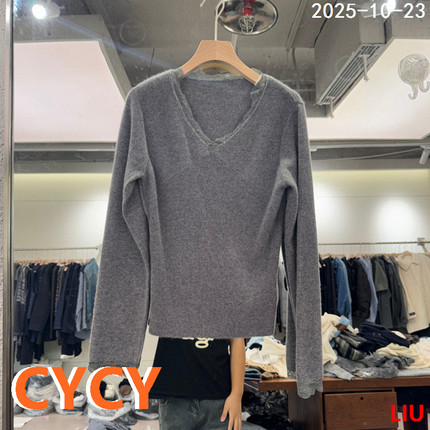 欧洲站2025冬季新款时尚百搭V领蕾丝拼接纯色山羊绒针织打底衫女