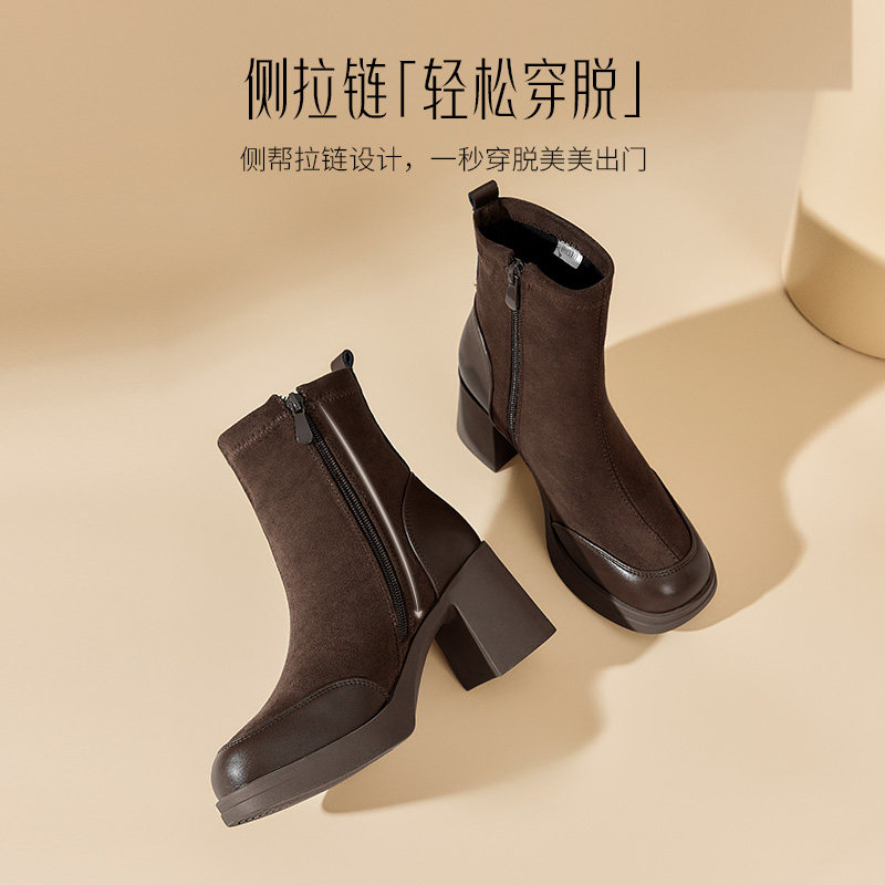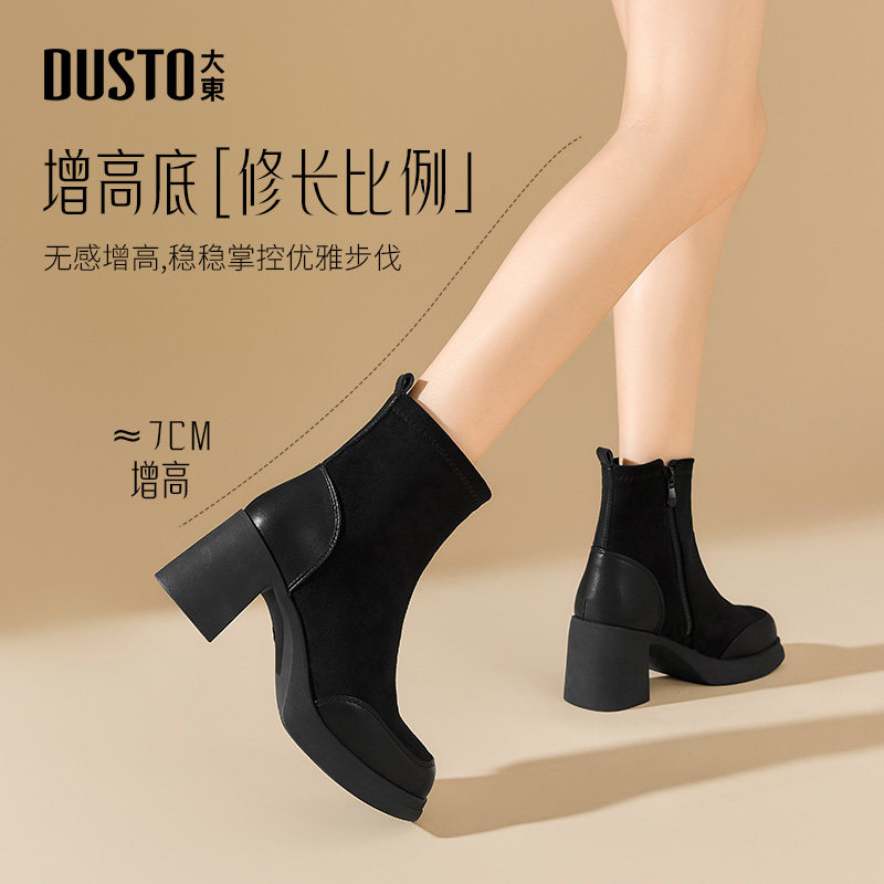 大东时装靴女鞋2025冬季新款简约风高跟粗跟侧拉链圆头短靴D1023D
