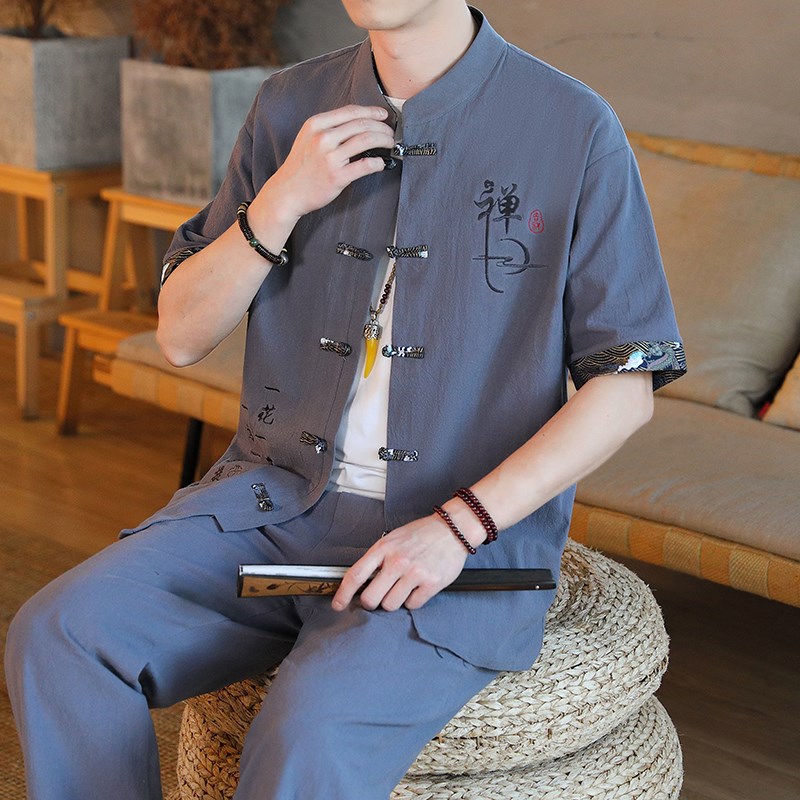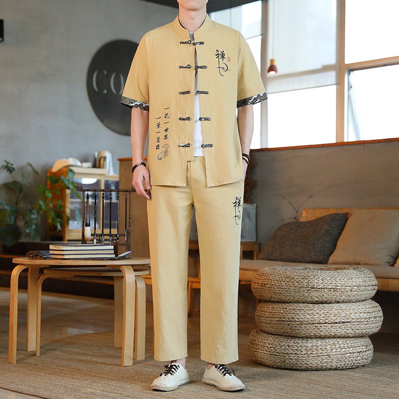 夏季男士套装复古中国风佛系唐装短袖长裤民族风汉U服休闲半袖开