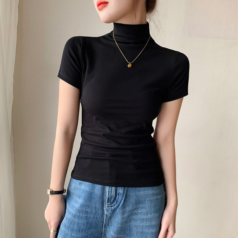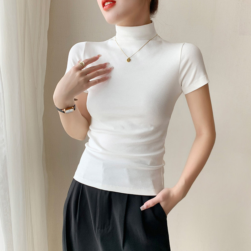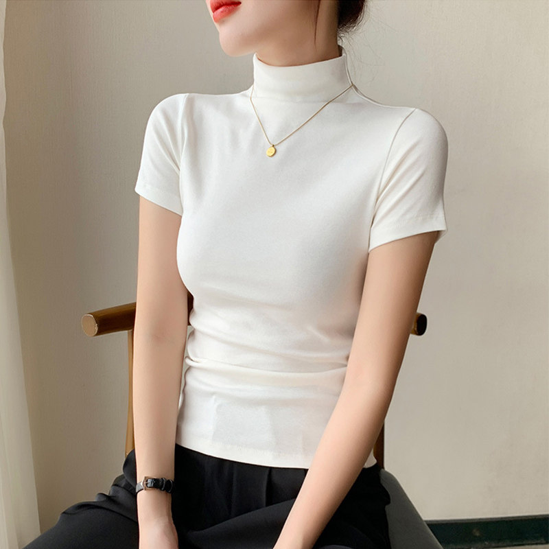 白色修身精梳棉半高领短袖t恤女夏季新款纯色百搭显瘦打底体恤衫