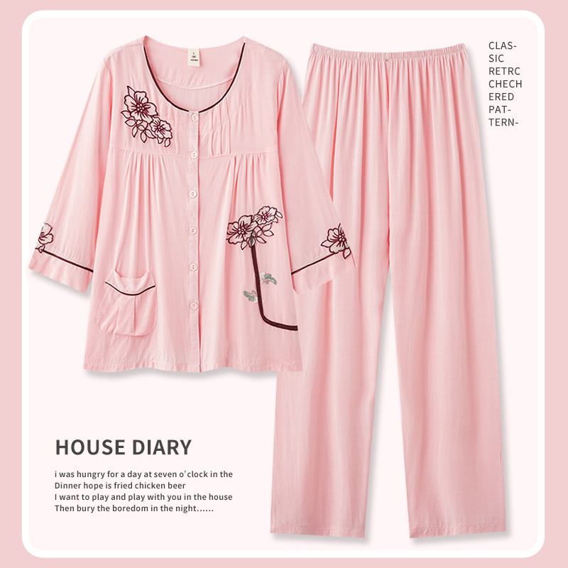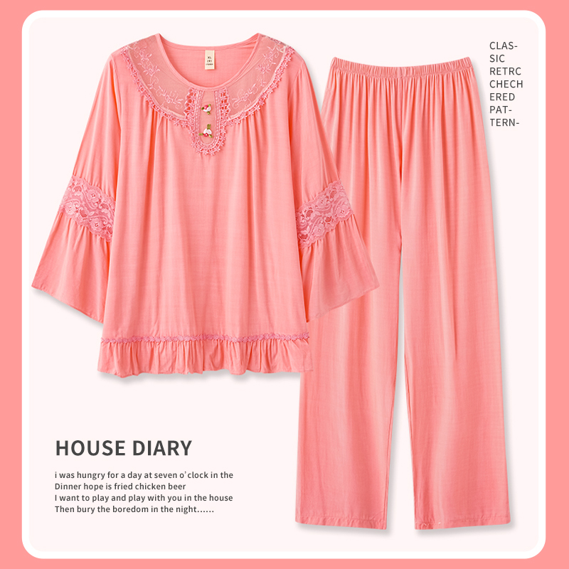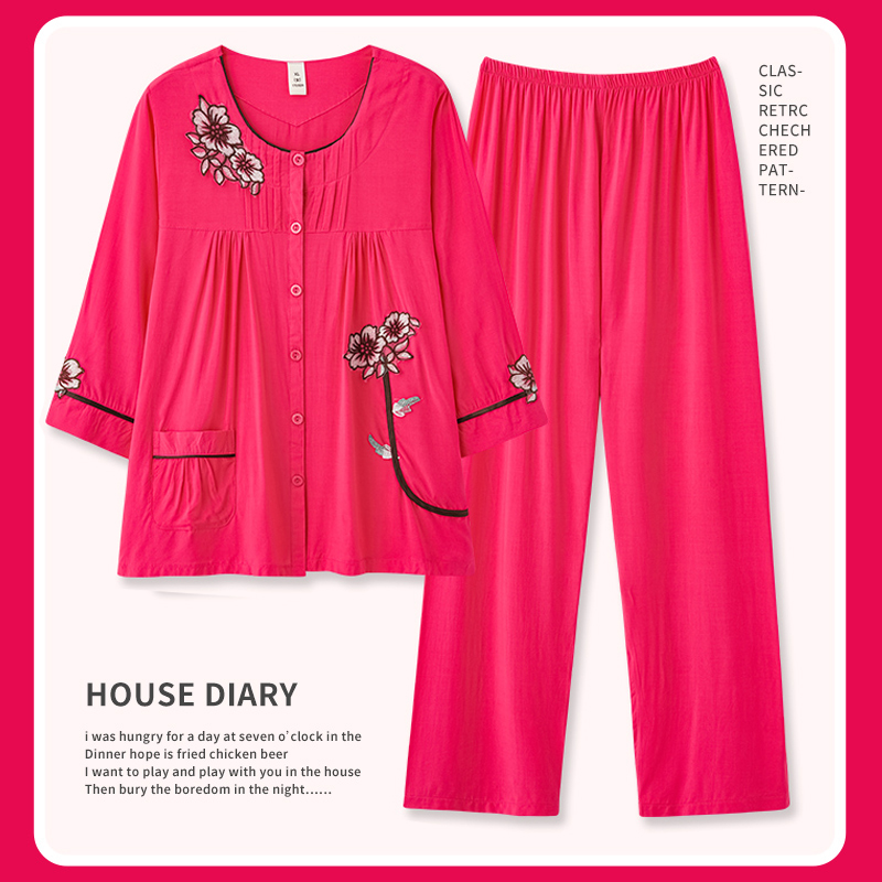 睡衣女夏纯色棉绸薄款七分袖长裤中青年妈妈宽松加大码套装家居服