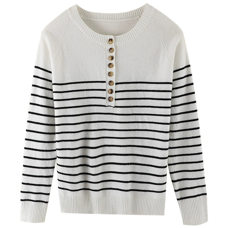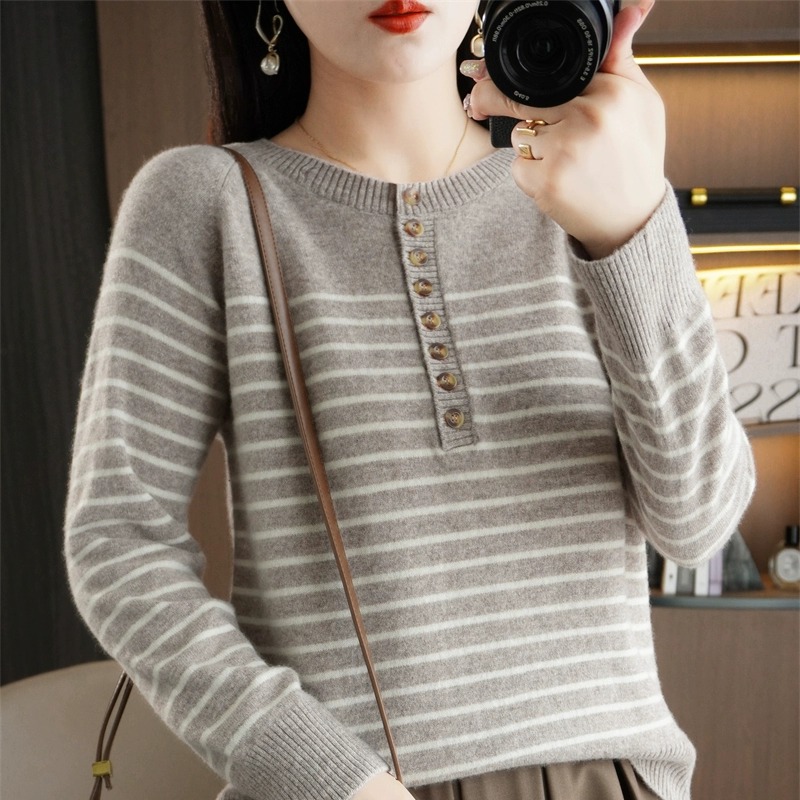 条纹半开领毛衣女秋冬季新款宽松大码上衣长袖内搭羊毛针织打底衫