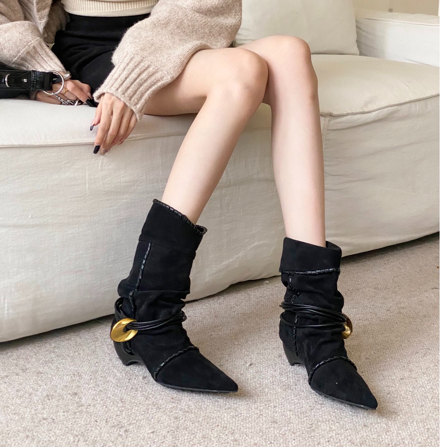 2025秋冬新款粗跟低跟靴子女卡其色磨砂绒面短靴美拉德西部靴短靴