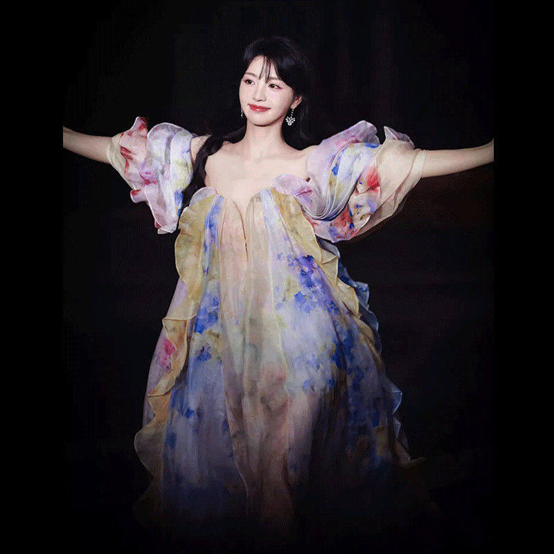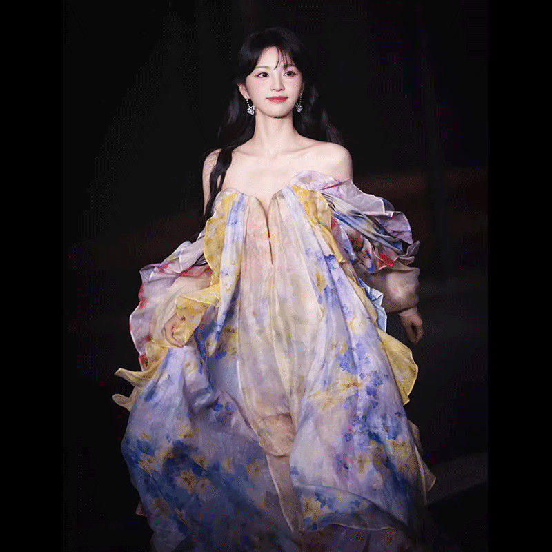 田曦薇同款连衣裙晚宴聚会国风深v领花仙子仙女裙抹胸吊带礼服裙