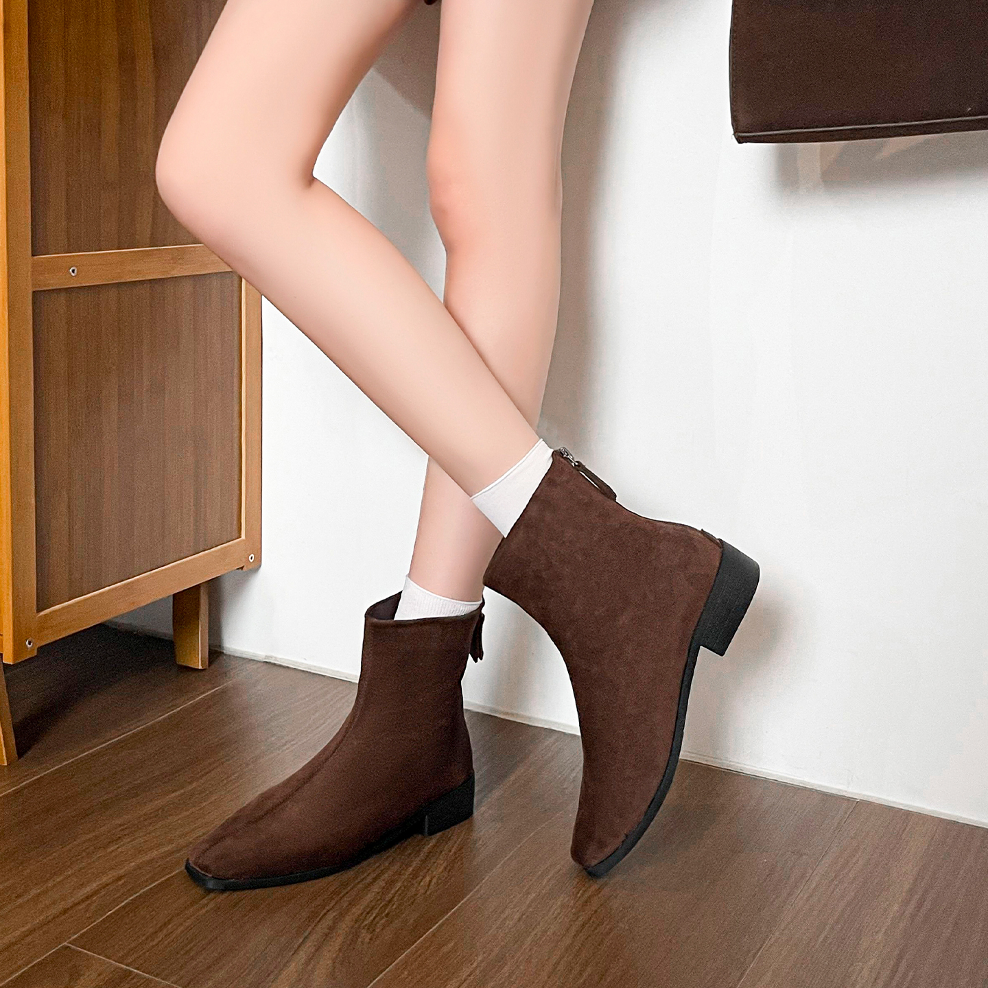 真皮版~韩系复古洋气小短靴女2025高级感法式绒面裸靴粗跟瘦瘦靴