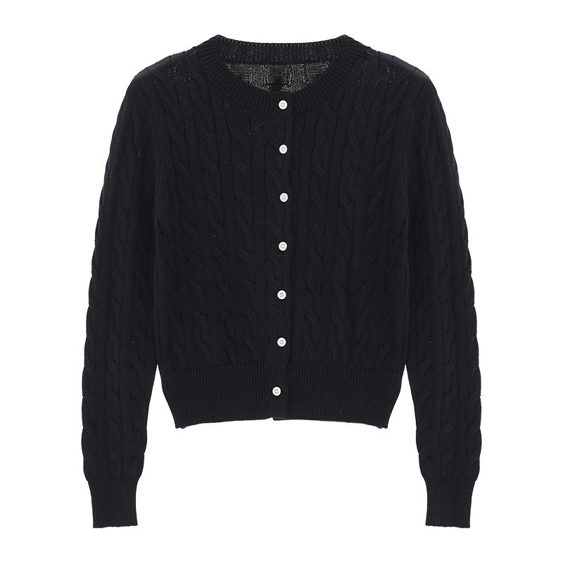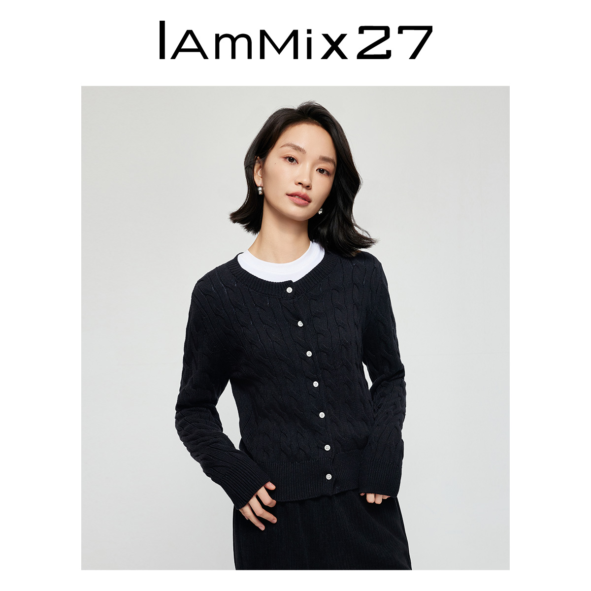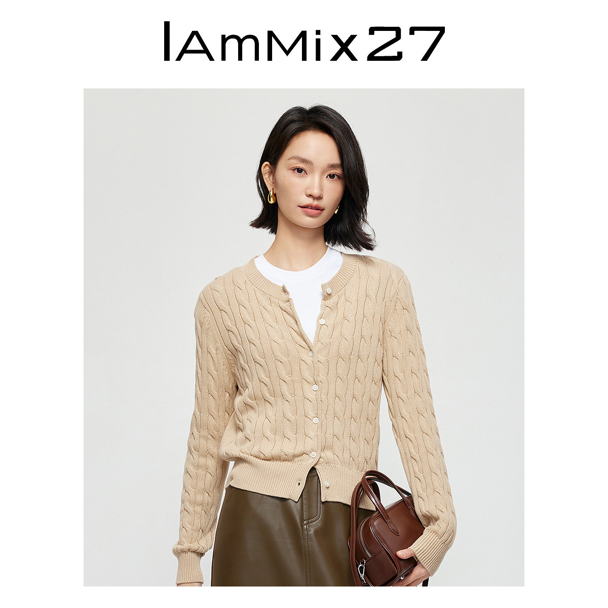 IAmMIX27全棉圆领开衫女短款显瘦文艺复古休闲百搭麻花针织衫毛衣