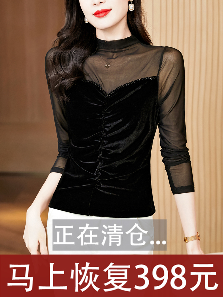 半高领金丝绒打底衫女秋冬新款设计感烫钻褶皱网纱上衣长袖T恤衫