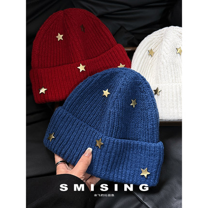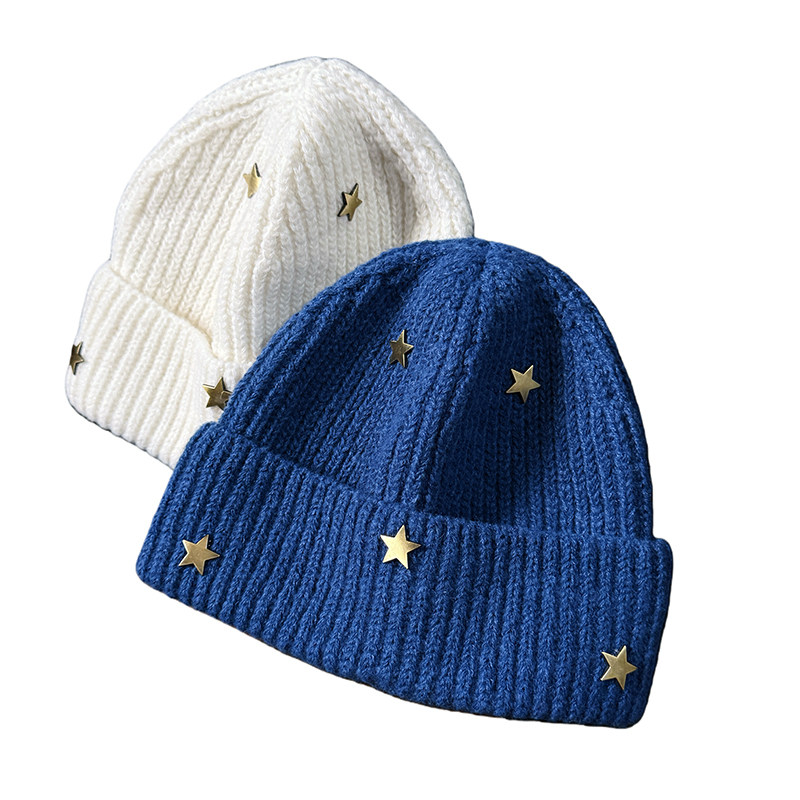 韩系ins复古金属五角星针织帽女秋冬季新款时尚百搭显脸小包头帽